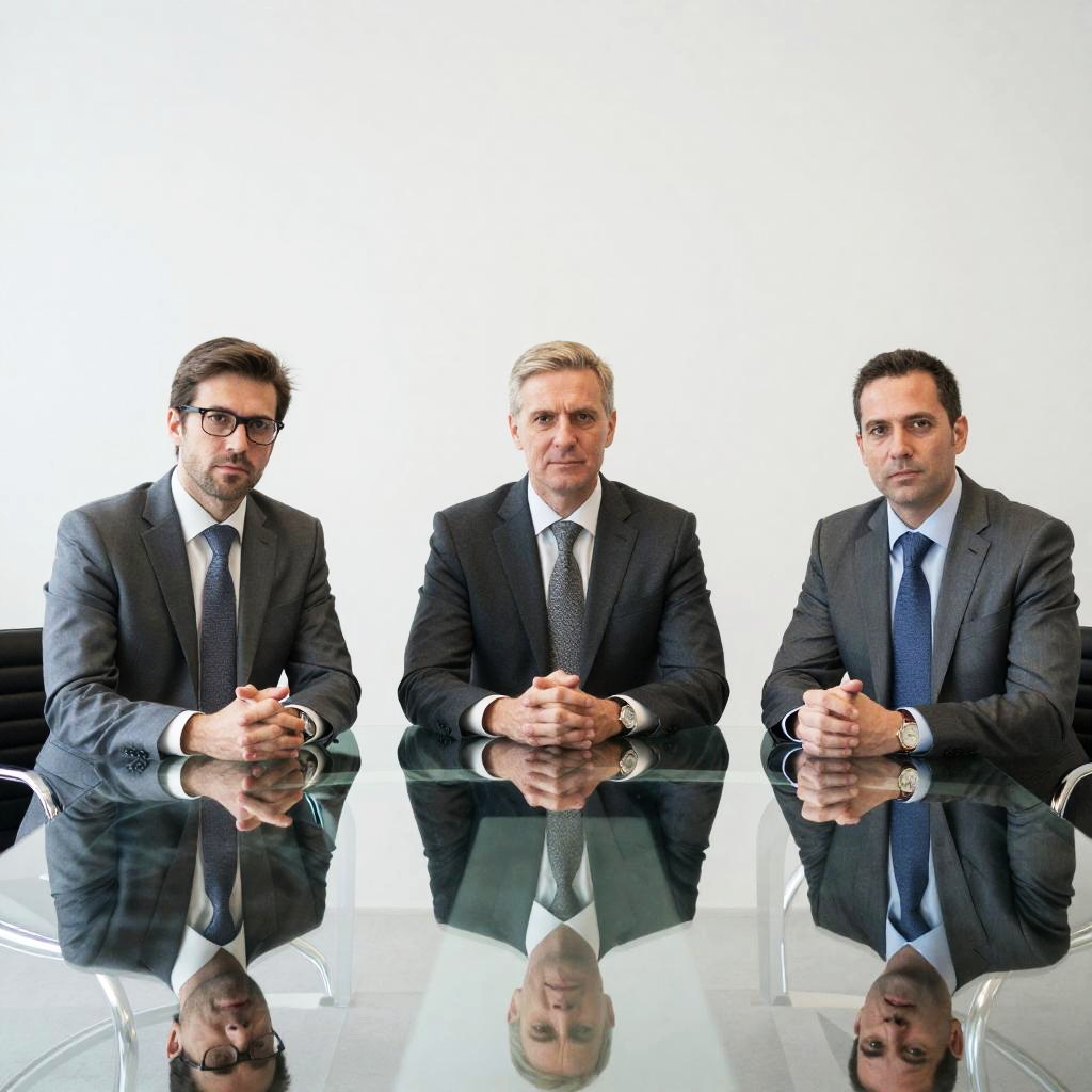 Three men in suits sitting around a modern glass conference table, serious expressions, office environment, high resolution, professional lighting