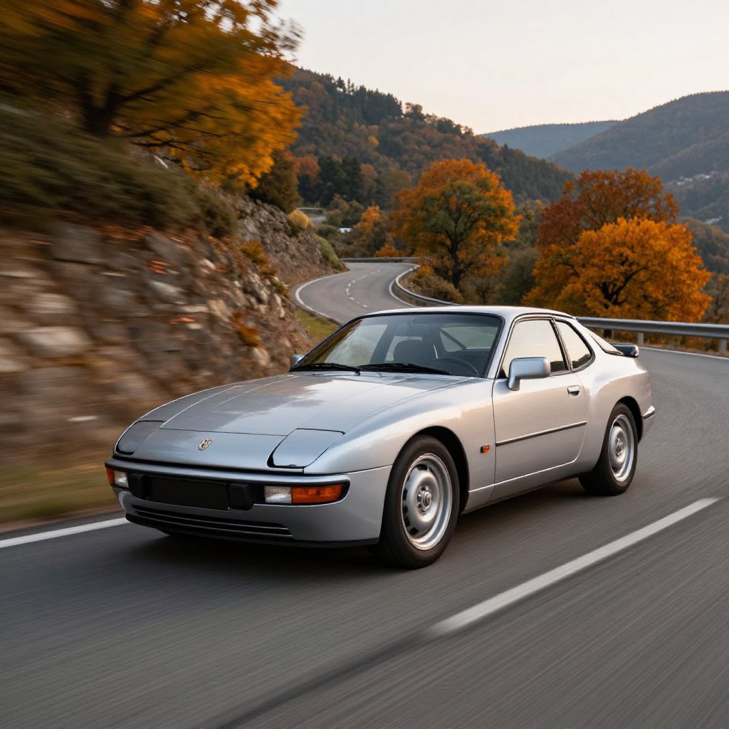 Porsh 944 speeding on a mountainous winding road, dynamic motion blur, vibrant autumn colors with falling leaves, sleek chrome details shining under soft golden hour light, powerful and elegant automotive design captured in high resolution