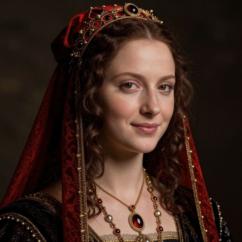 This is a photograph of a fair-skinned woman with wavy, dark brown hair, wearing a regal, medieval-style outfit. She has a slight smile and is adorned with a gold and red jeweled tiara and a matching necklace with a large, oval red gem. She also wears a rich, red velvet veil with gold trim over her head. Her black gown is embellished with gold details. The background is dark, which makes her light complexion and detailed attire stand out. The lighting highlights her clear skin and the textures of her clothing. The overall style is reminiscent of a Renaissance or fairy tale queen.