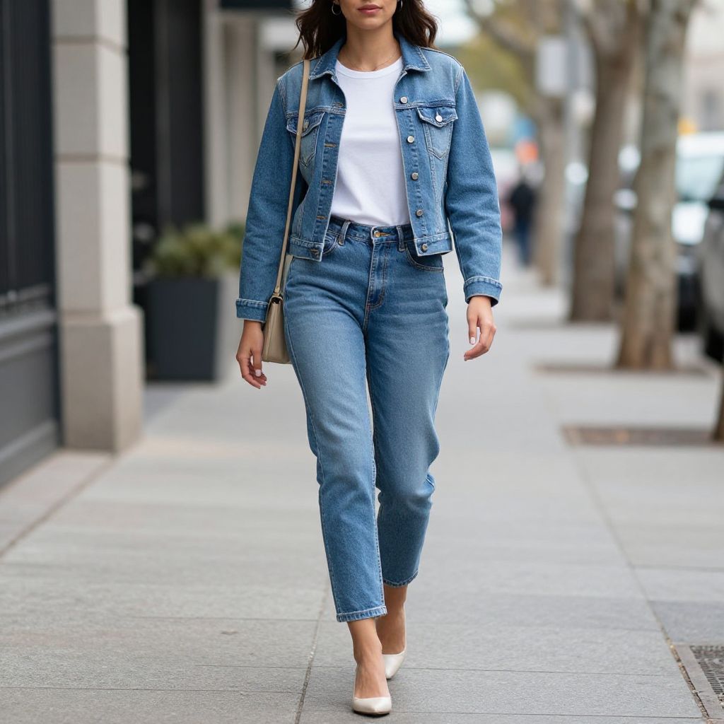 Outfit Jeans Costume, woman in jeans and a denim jacket walking down a sidewalk