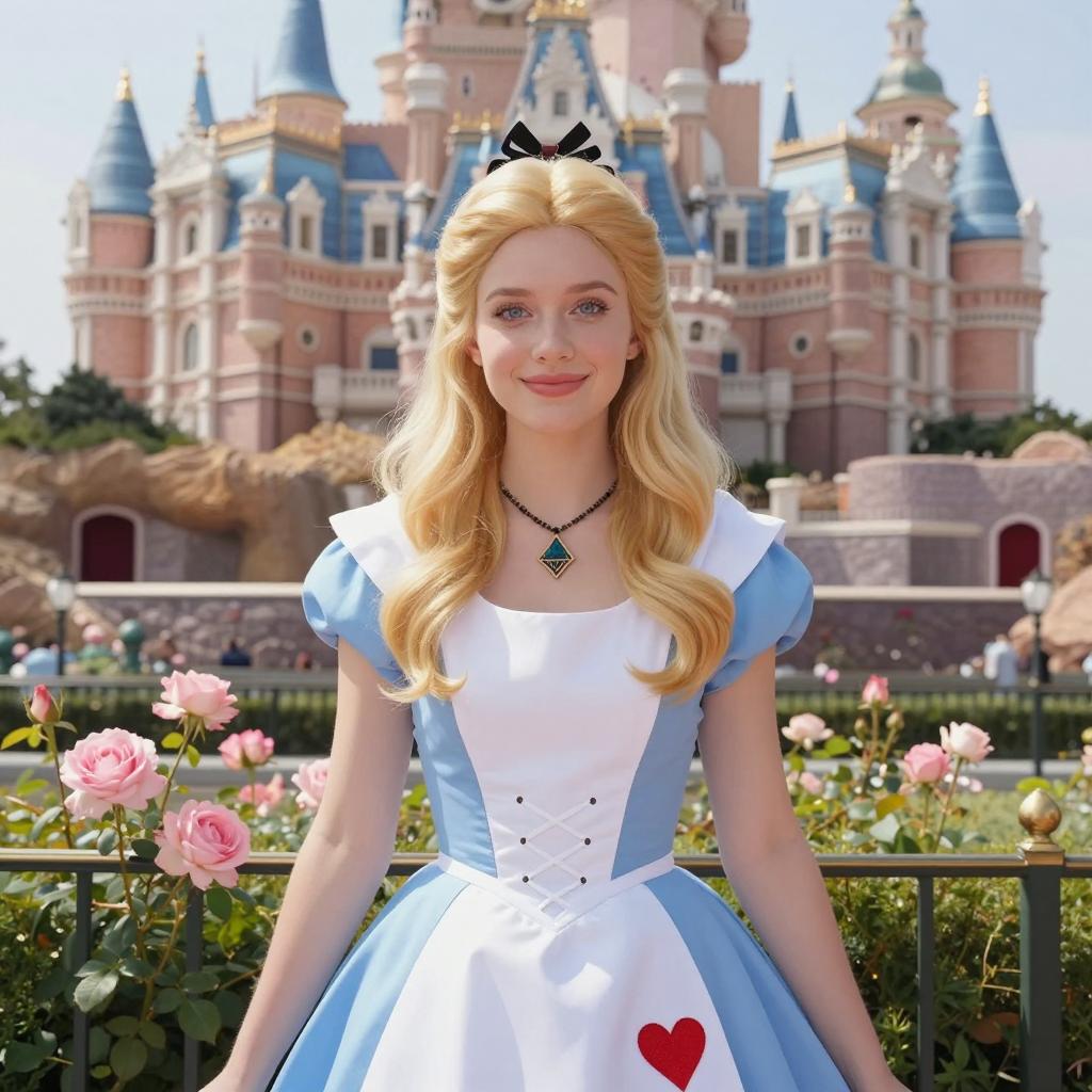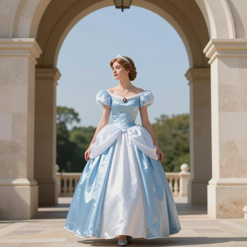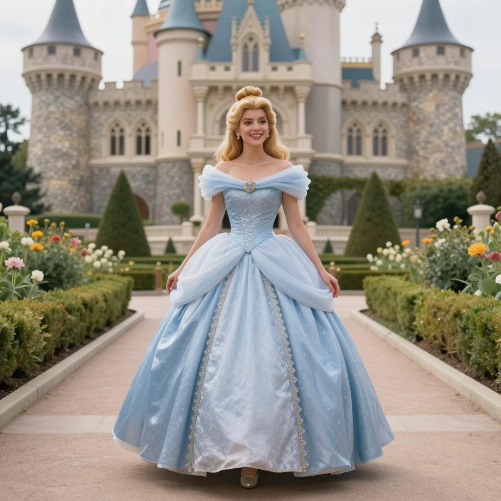 Disney princess print dress, photorealistic, young woman, standing, Disney Princess dress, colorful dress with animated Disney Princesses, blue straps, long dress, brown hair, green eyes, fair skin, outdoor setting, castle background, bright sunlight, lush garden, red roses, stone path, animated characters on dress: Belle, Cinderella, Aurora, Ariel, Rapunzel, Tinker Bell, realistic ures, detailed background, clear blue sky, digital art, high quality, fantasy theme, magical atmosphere, T2I style