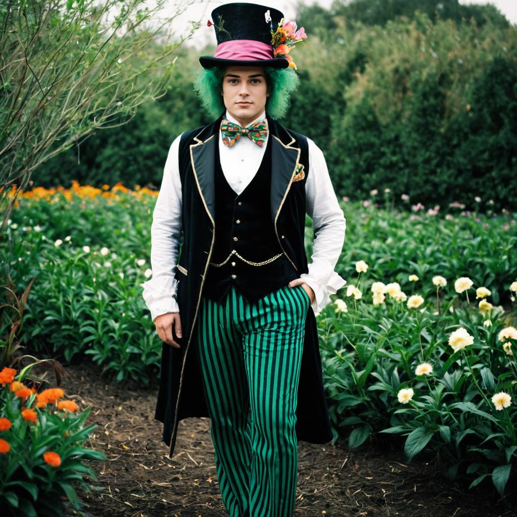 Plus size mad hatter costume,male focus, hat, 1boy, solo, green hair, bow, striped pants, bowtie, top hat, pants, vest, closed mouth, striped clothes, flower, coat, looking at viewer, plant, standing, long sleeves