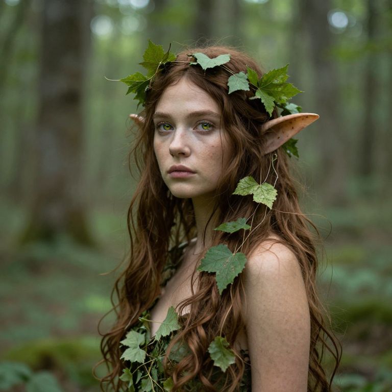 A dryad with brown hair and green leaves intertwined in her hair stands in a deciduous forest, her eyes reflecting the forest's tranquility.