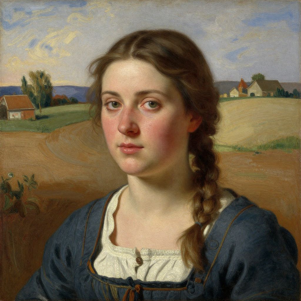 Realistic oil painting of a young Caucasian woman with fair skin, brown braid, blue dress, and white blouse, set against a rural countryside backdrop