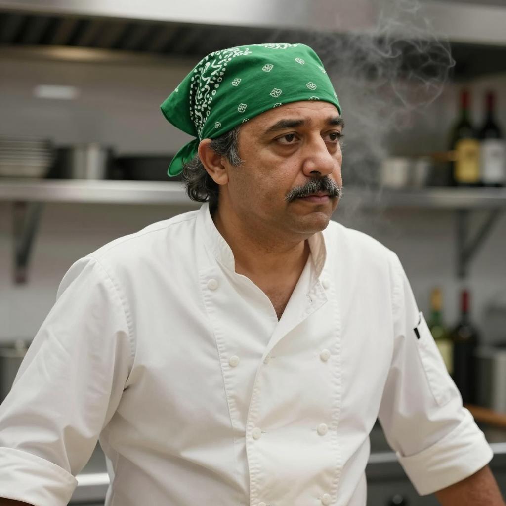 A photograph of a middle-aged man with olive skin, dark hair, and a green bandana with white patterns. He wears a white chef's jacket, slightly open at the collar. He looks slightly to the right with a neutral expression. His right hand rests on a kitchen counter. The background includes a kitchen with stainless steel appliances, bottles, and shelves. He is in a cooking setting. Steam is visible in the background. The man has a faint mustache and his hair is partially tied back. There are two visible bottles behind him.