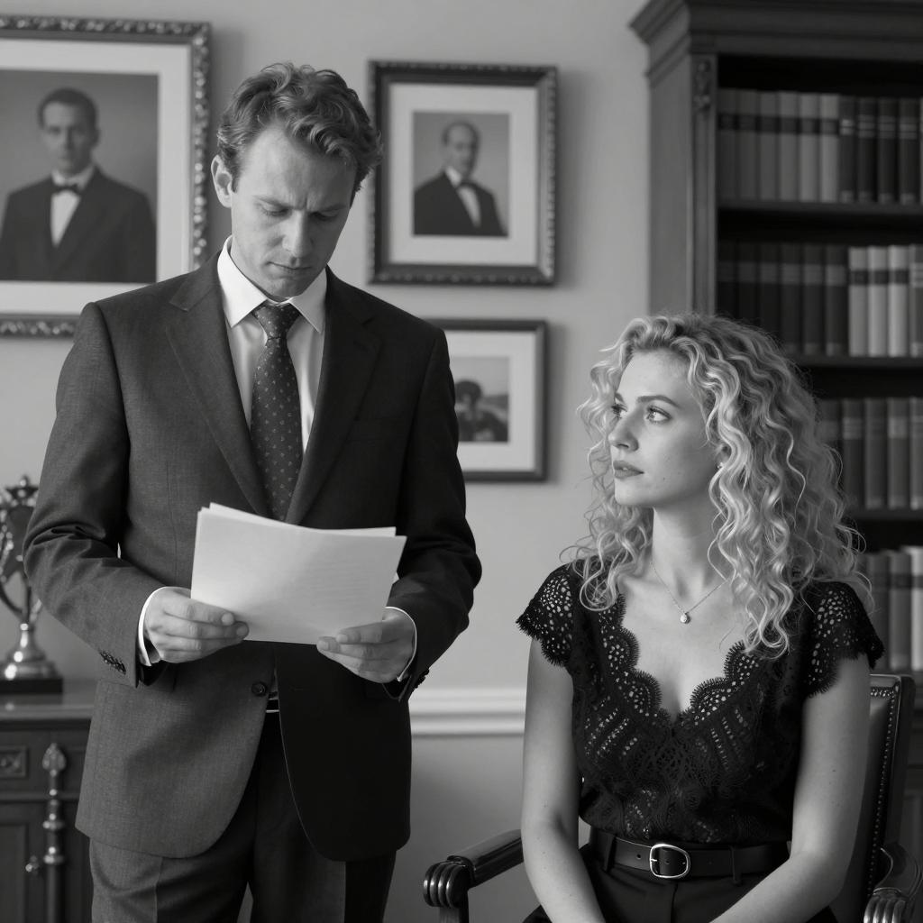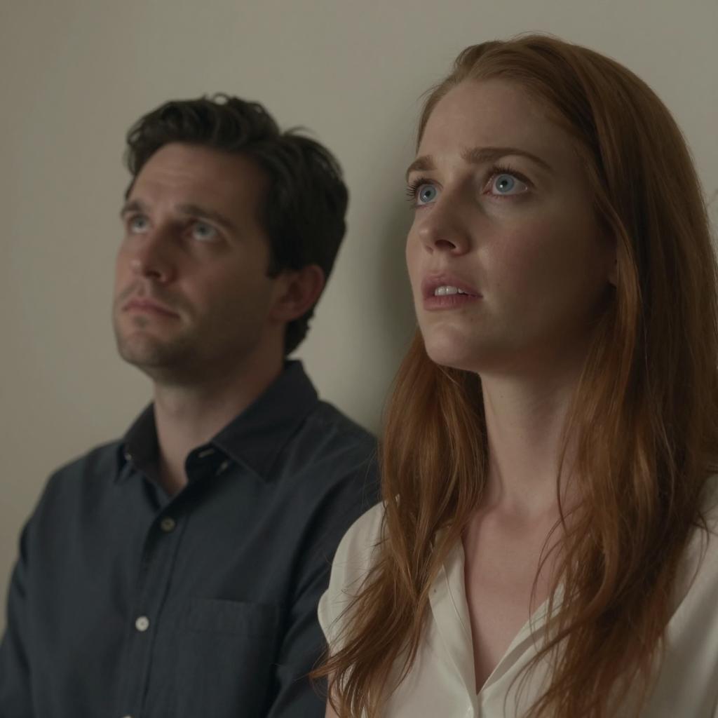 Two people at a dining table. Blonde woman in red dress, hand to face, looking down. Man with dark hair, glasses, black suit, white shirt, patterned tie, looking slightly to the right. White flower pins on their clothing. Table has food, milk bottle, glass of red liquid, candle, dishes. Dimly lit room with curtains, wooden beams, and a bookshelf in the background.
