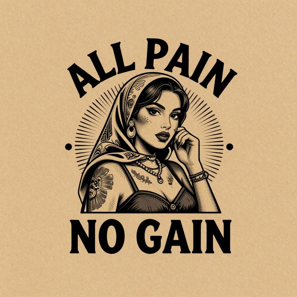 Black-and-white illustration of a woman with a headscarf, tattoos, and necklace, with "ALL PAIN NO GAIN" text above and