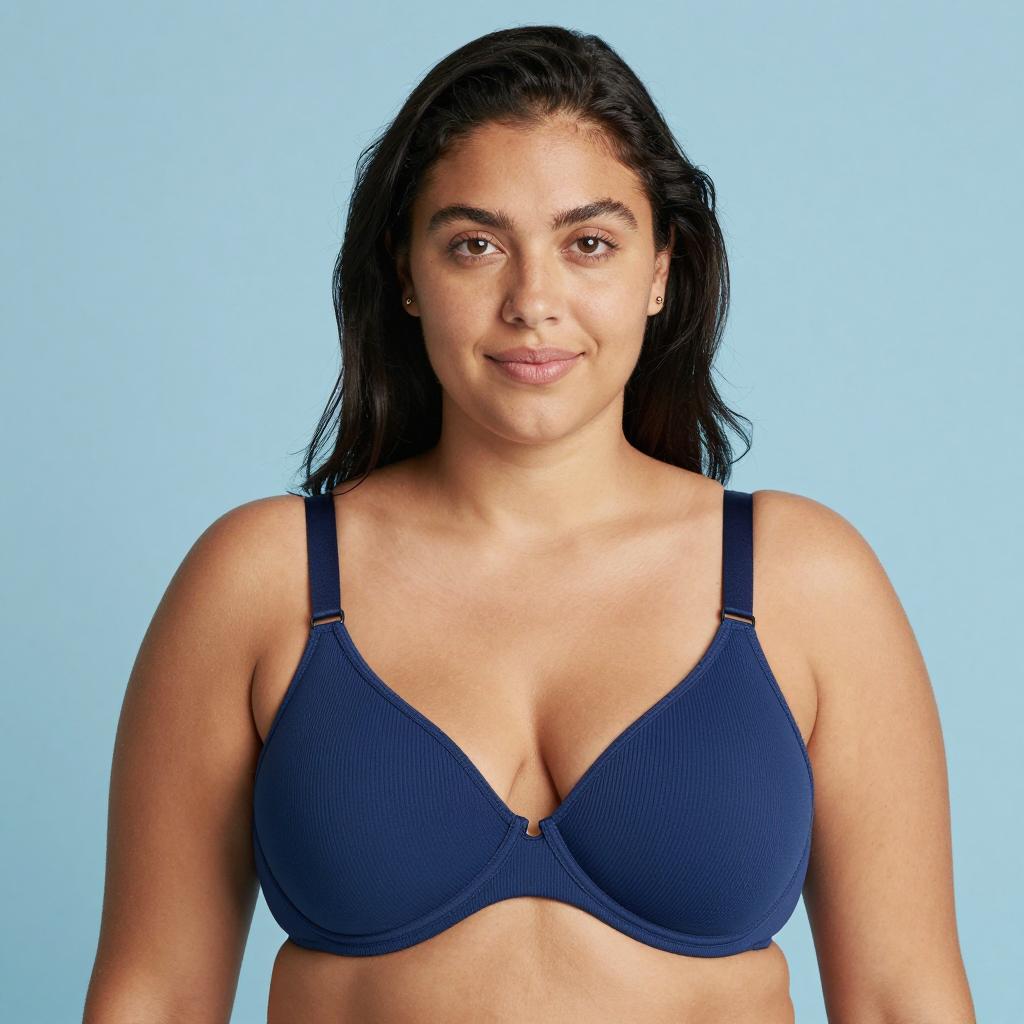 Photograph of a woman with light brown skin, long black hair, brown eyes, and a slight smile. She wears a blue, striped, underwired bra with adjustable straps. Her chest is medium-sized, and she has small earrings. The background is a solid light blue. She is centered in the frame, facing forward.