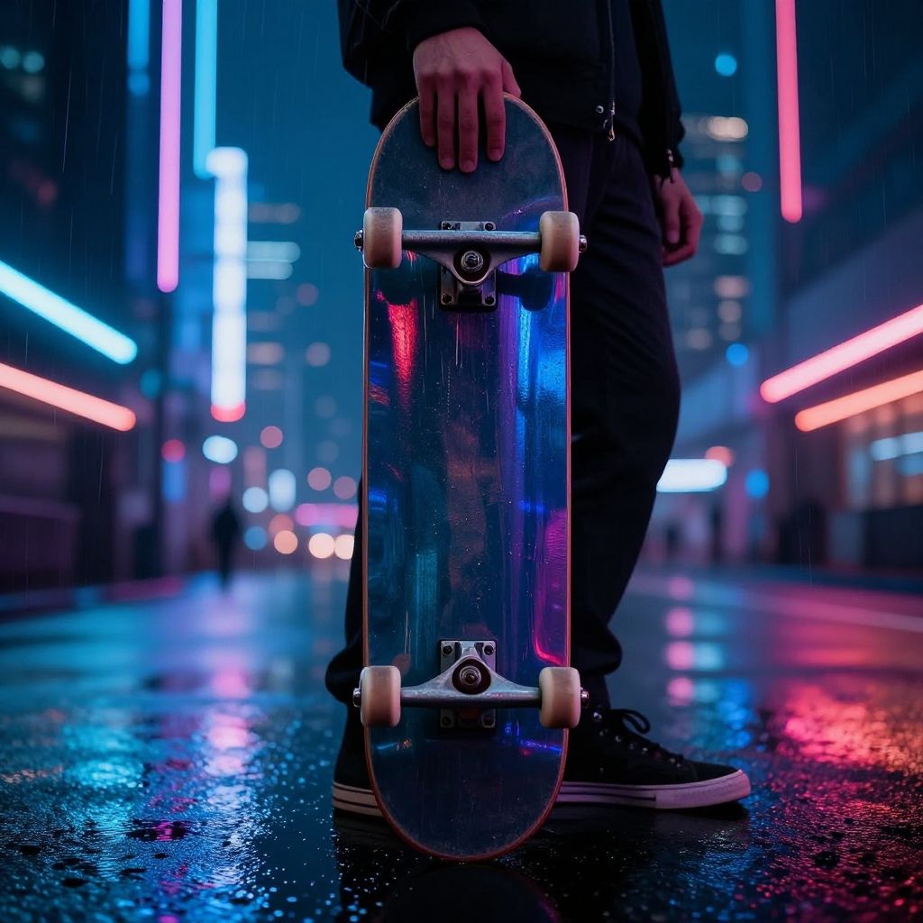 Hand holding skateboard, futuristic cyberpunk cityscape, neon lights reflecting on polished deck, rainy night atmosphere, moody and vibrant colors, high detail