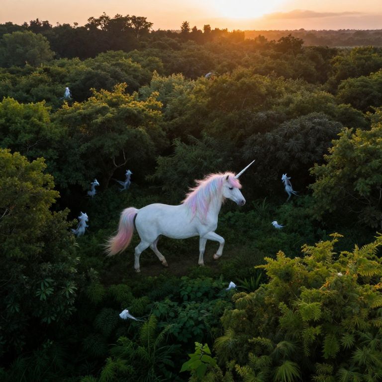 An aerial view over an ancient, mystical forest at dusk unveils a vibrant tapestry of life, reminiscent of narrative paintings from a bygone era. The scene is set with a majestic unicorn gracefully traversing the verdant landscape, its iridescent mane and horn shimmering under the soft, golden light filtering through the dense canopy. This illumination casts a magical glow on the lush foliage below, setting the stage for an enchanting ballet of ethereal beings as twilight's waning embrace hints at creatures lurking in the shadows, preparing to dance amidst the fading sun's final rays.