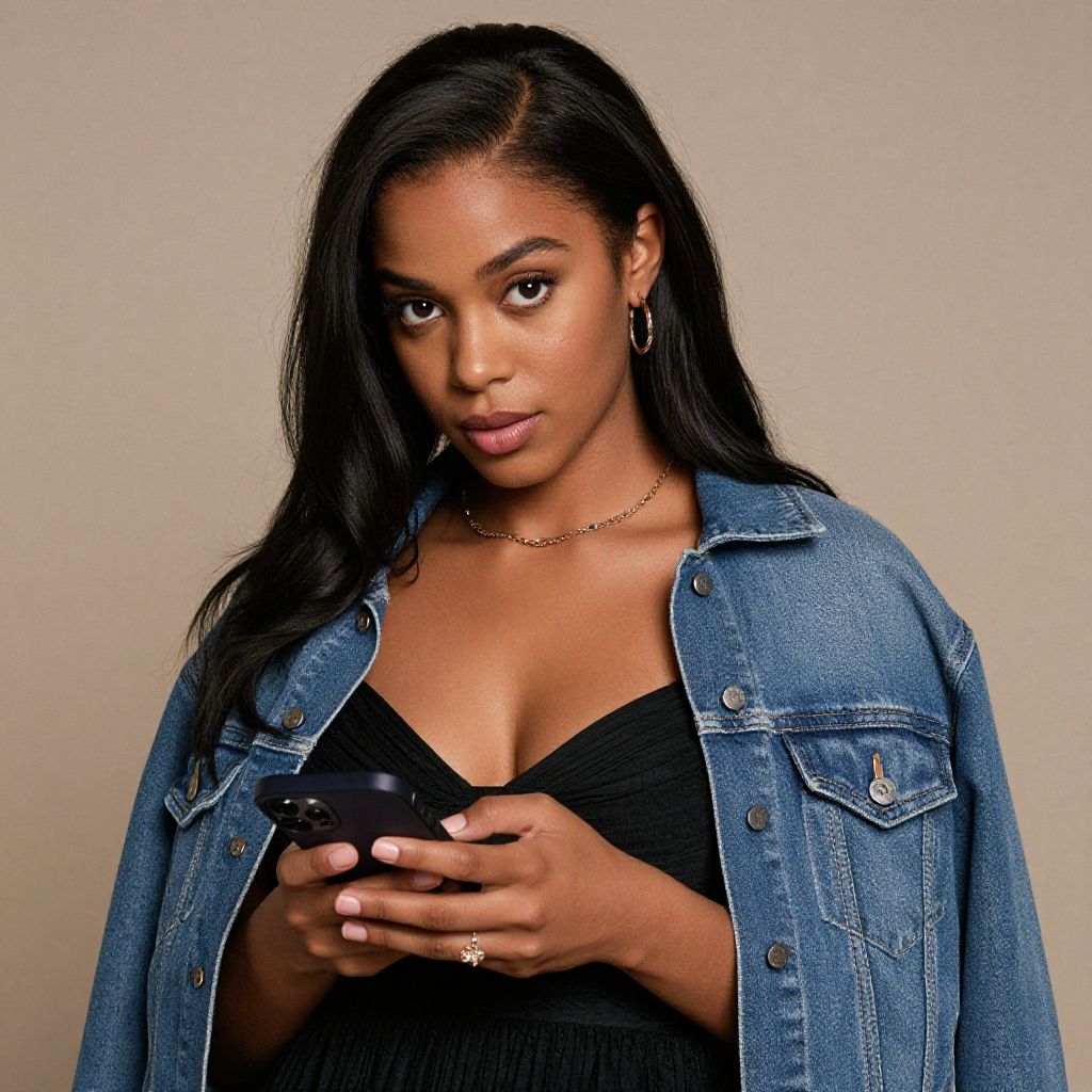 Photograph of a beautiful Black woman with long black hair, wearing a denim jacket over a black top, holding a smartphone, looking intently at the