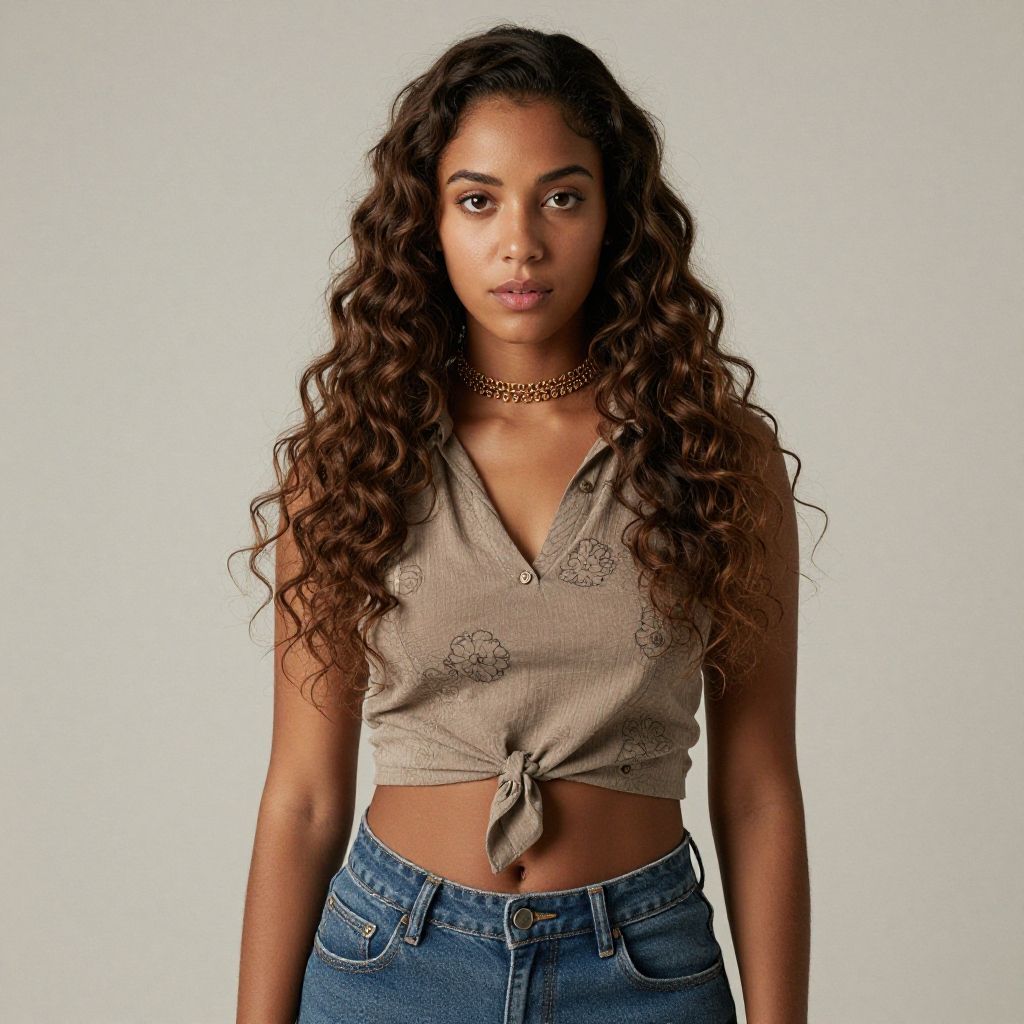 Photograph of a young Black woman with long, straight, black hair, wearing a blue denim jacket over a black, low-cut top that reveals a hint of cleavage. She is holding a black smartphone in both hands, looking directly at the camera with a neutral expression. She has hoop earrings, a thin chain necklace, and a silver ring on her right hand. The background is a plain, light beige color. Her skin is smooth and glowing, and she has well-defined eyebrows and subtle makeup. The denim jacket has classic stitching and buttons. The overall style is modern and casual.