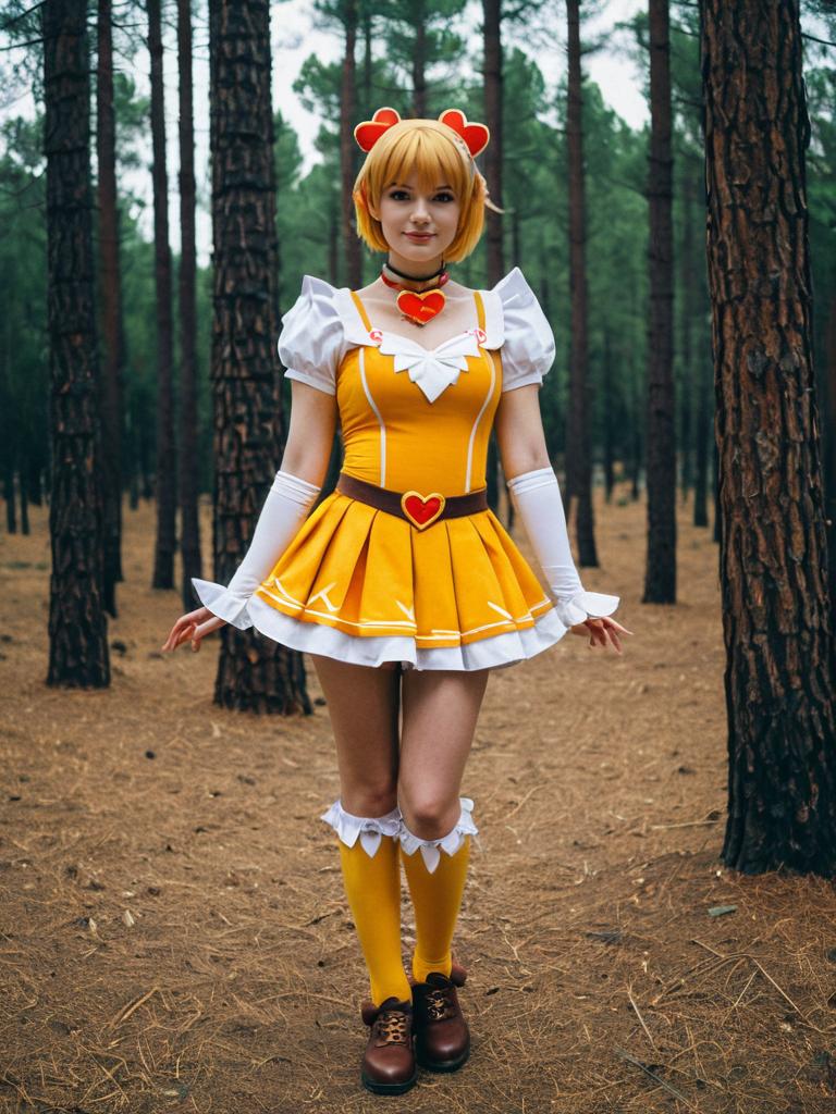 Photo-realistic cosplay photo of person in cure pine costume. Full body. Standing. Full length. 1girl, yellow eyes, brown eyes, short hair, blonde hair, heart hair ornament, hair bow, orange choker, earrings, magical girl, one side up, magical girl, wrist cuffs