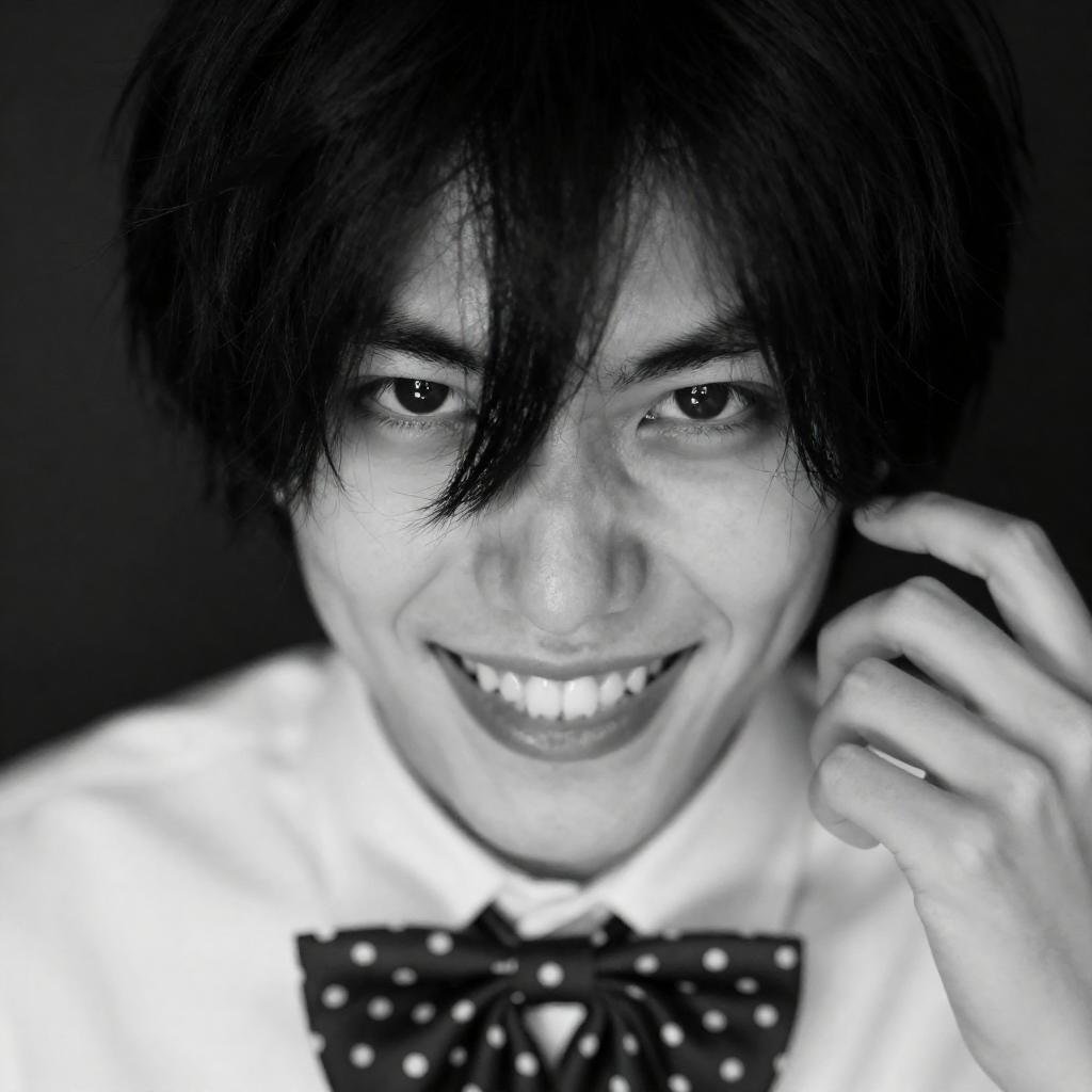 Close-up photograph of a person with dark, messy hair partially covering their face. They have pale skin, a wide-eyed, intense expression, and a sinister grin showing sharp teeth. They wear a white collared shirt with a polka-dotted bow tie. One hand is raised near their face. High contrast, black and white.