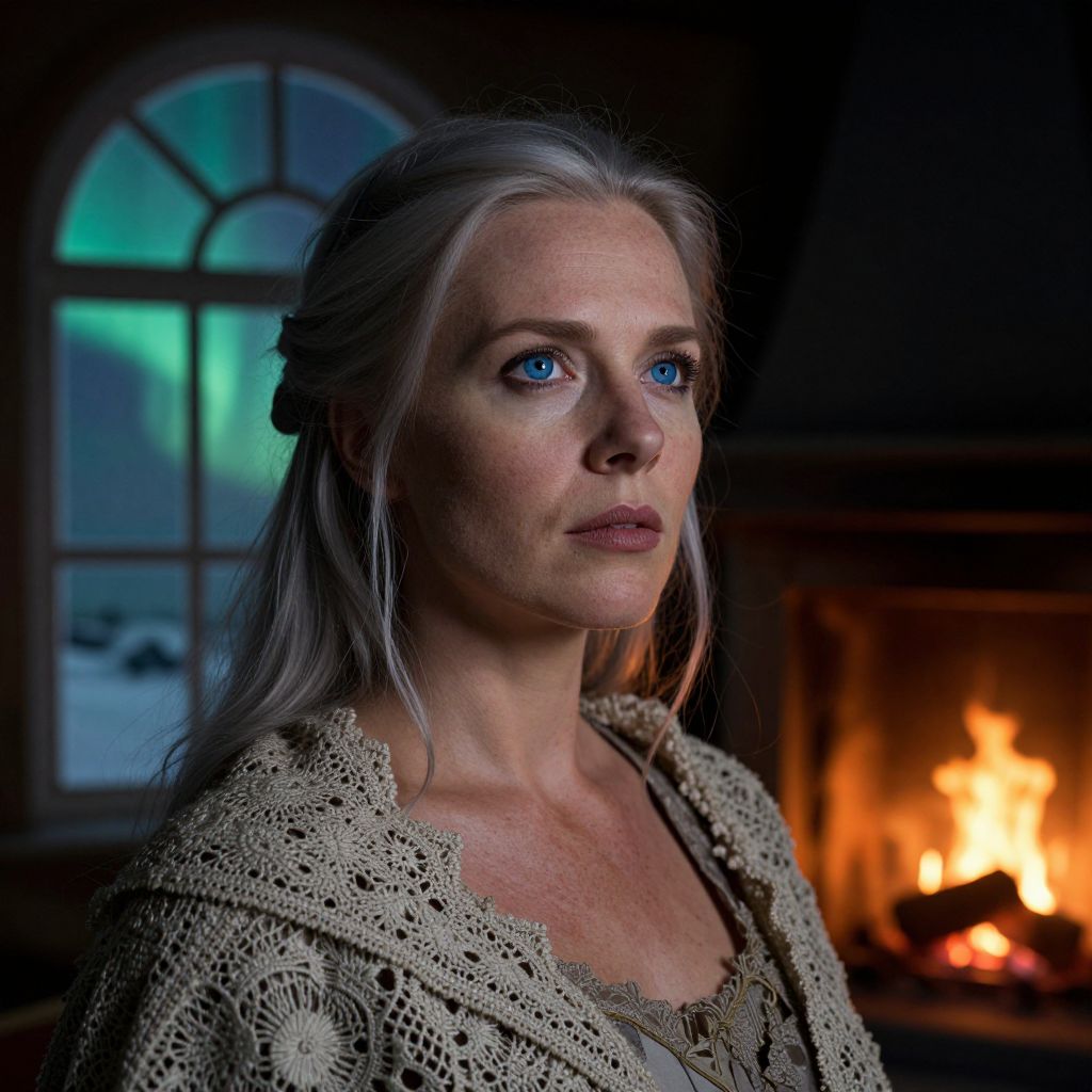 A photorealistic portrait photograph captures the enigmatic essence of a European woman with striking blue eyes and silver-streaked hair, masterfully blending hyperrealism with dramatic chiaroscuro lighting from an unusual side angle. The focus rests on her subtle yet captivating facial expressions as she contemplates the ethereal beauty of the aurora borealis visible through an ancient arctic window behind her. Warm fireplace light illuminates her weathered skin and intricate lace shawl, evoking a sense of warmth, nostalgia, and wonder in this enchanting, otherworldly setting.