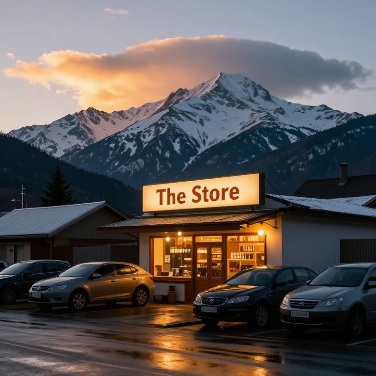 The image shows a small shop bathed in the warm light of a sign with the inscription, The store is located against the background of a majestic mountain covered in snow, with clouds illuminated by the setting sun in the background, There are several cars in front of the store, the wet asphalt reflects the light of the sign and the evening sky, The atmosphere of the image conveys a sense of calm and comfort in a small village or suburb