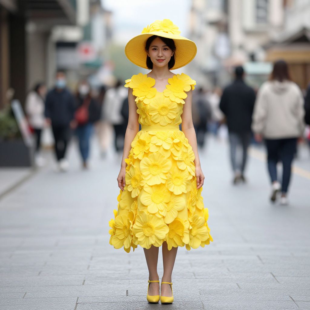 "Yellow Flower Costume, woman in yellow flowered dress and hat standing on street"