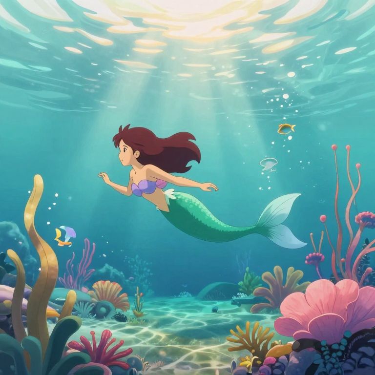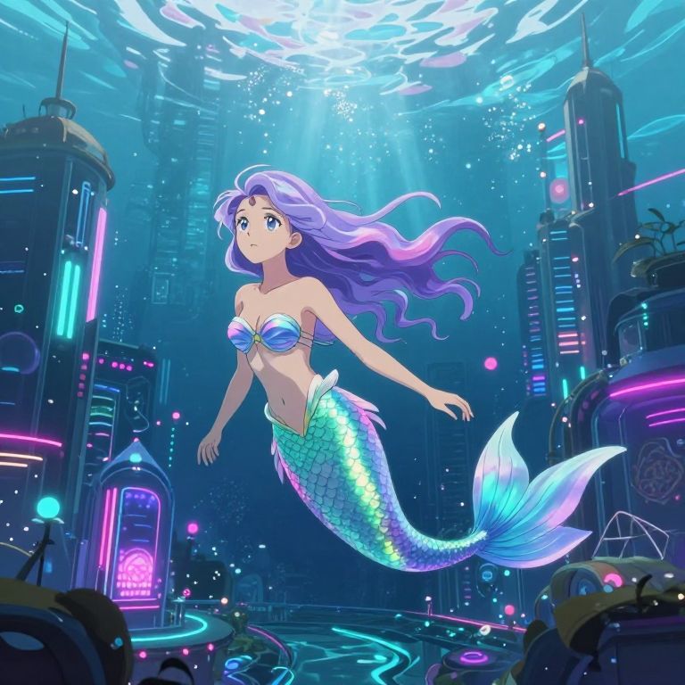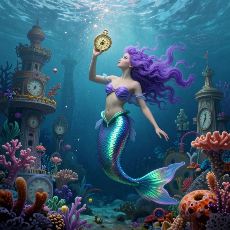 Craft an image blending surrealism with anime aesthetics, showcasing a mesmerizing underwater world where a regal mermaid gracefully perches on a colossal, distorted timepiece. This unique vantage point unveils the intricate workings of the clock beneath her feet, revealing gleaming gears that sparkle like precious stones. The captivating radiance emanating from bioluminescent flora and fauna lights up the surrounding water, creating an otherworldly ambiance that stirs both fascination and introspection as the mermaid ponders her existence within this fantastical aquatic realm.