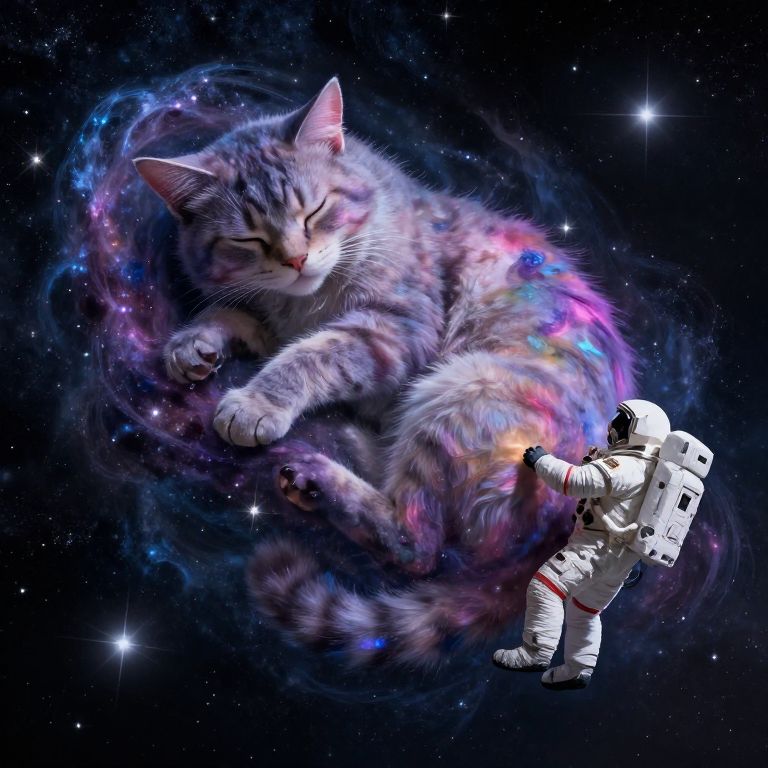 A colossal feline, composed of swirling galaxies and stardust, peacefully naps across the shoulders of a lone astronaut drifting through the void.