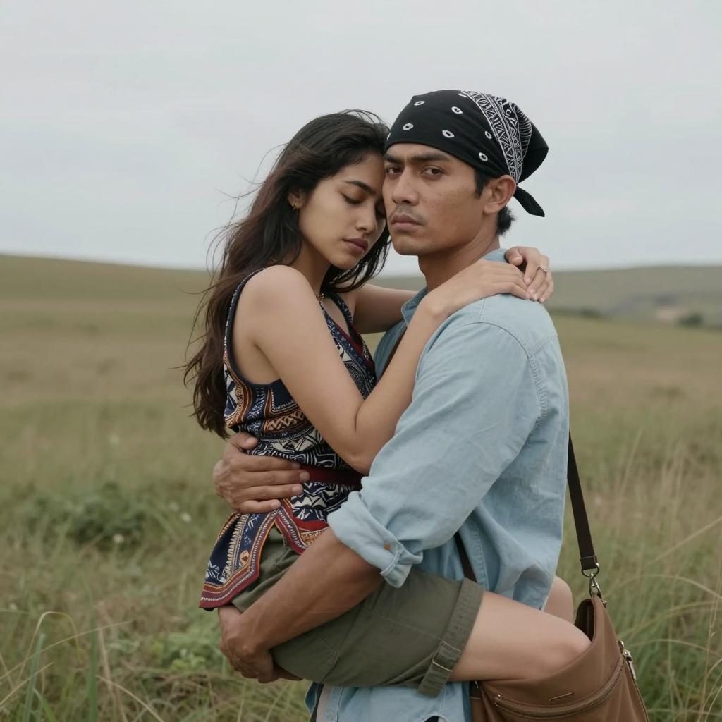 Two people sitting on a large fallen tree in a forest. The man stands behind, wearing a brown jacket and beige pants, with a beard and glasses. The woman sits in front, wearing a light-colored headscarf and beige shirt, looking to the side. Sunlight filters through tree branches in the background. Both appear focused. The man's facial expression is intense, while the woman's is neutral. Blue sky visible in the background.
