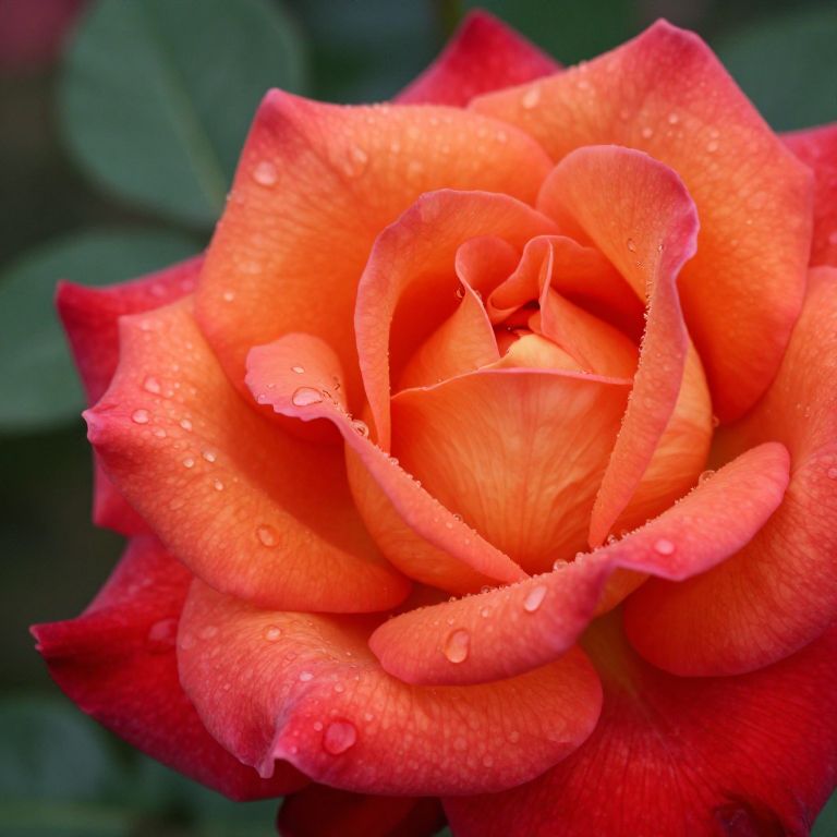 Photograph of a vibrant orange and red rose in full bloom. The petals are intricately layered, with the outer petals displaying a gradient from bright orange to deep red at the edges. Each petal is adorned with small, clear water droplets, adding a fresh, dewy texture. The background is blurred, featuring dark green leaves, which contrasts with the vivid colors of the rose. The image captures the delicate, velvety texture of the petals and the natural beauty of the flower.