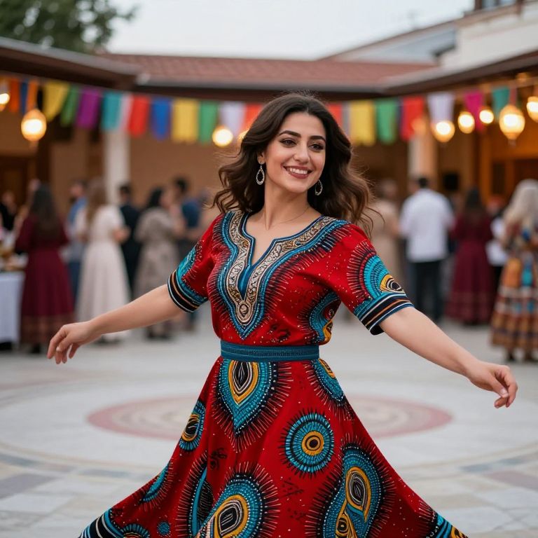 A vibrant Turkish female in a festive red and turquoise Ankara-inspired Turkish dress, smiling warmly with soft brown eyes and fair skin, dancing in a large open courtyard at a traditional Ramadan celebration in Bursa, with lanterns and colorful flags in the background.