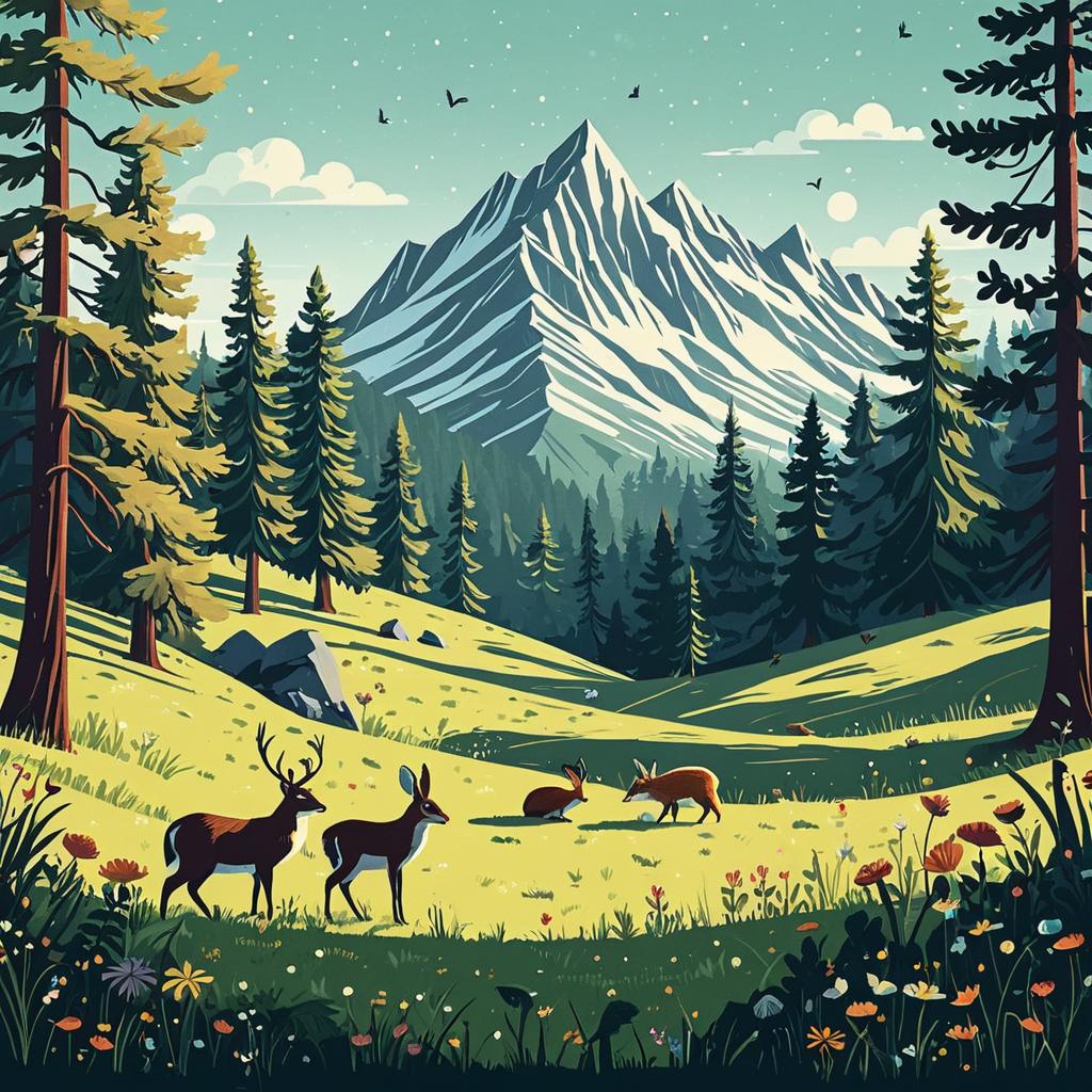 Serene Mountain Meadow with Woodland Animals Illustration