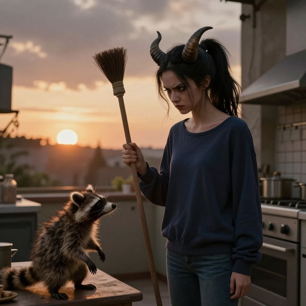 Masterpiece, (5:30 pm) overcast, early sunset, dim amber glow, Rembrandt lighting, photorealistic, wide angle, high perspective, sharp focus, 26-year-old succubus, (cute: 1.5) (petite: 1.3), black hair, (bushy ponytail: 1.3), (small: 1.5 horns), (tiny body: 1.5) (160cm height: 1.5) (small breasts: 1.5) With Thick Eyelashes, small mouth, (realistic skin texture: 1.3), dark hazel eyes, (extremely delicate: 1.3), in the kitchen, wearing a (large, loose, boxy, long-sleeve dark-blue band-collar shirt: 1.5) and jeans (irked, threatening expression), holding a (broom), (confronting a (small but weird, furry, supernatural creature): 1.8)