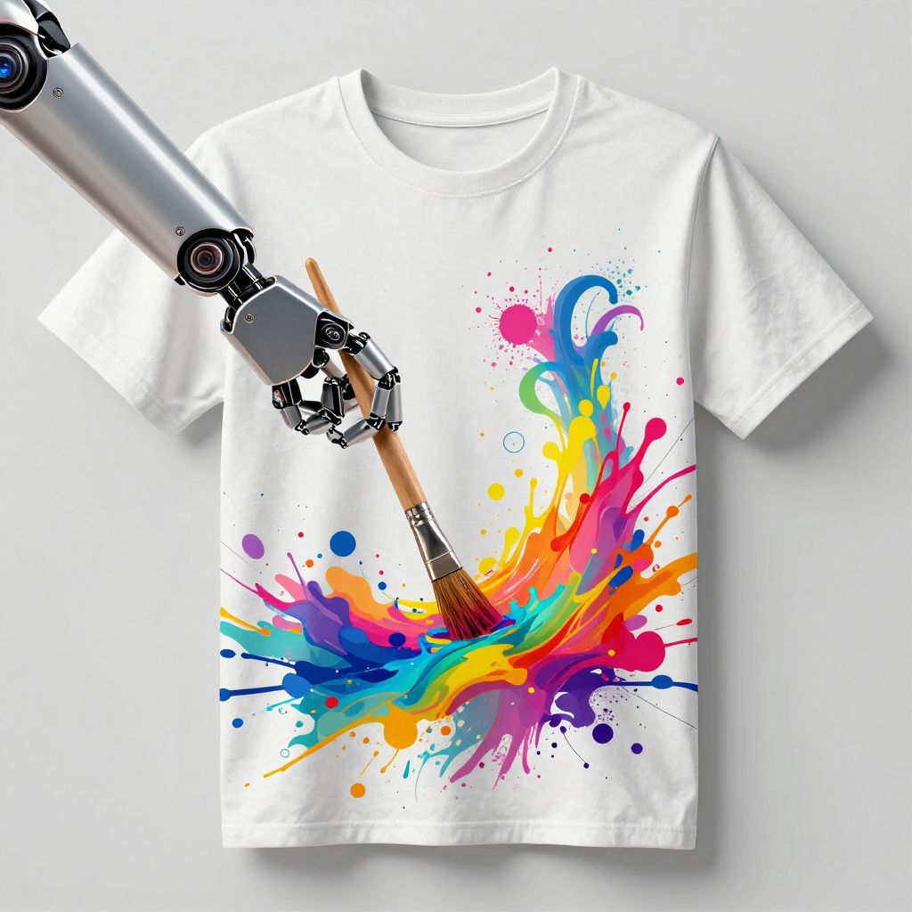 T shirt design AI with a creative robotic arm holding a paintbrush producing vibrant splashes of color on canvas-like fabric, integrating digital and traditional art, vivid palette, dynamic movement, contemporary illustration style, tech meets art theme for modern clothing.