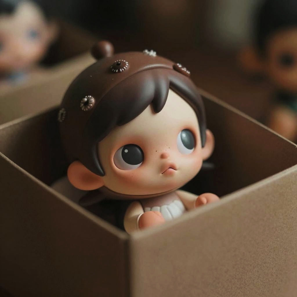 Photograph of a chibi-style doll with a large head, big round blue eyes, small pink lips, and dark brown hair adorned with small, shiny beads. The doll, with a fair complexion and wearing a white top, is seated inside a brown cardboard box. The background is blurred, but other similar dolls can be faintly seen. The image has a soft, warm light, emphasizing the doll's innocent and cute appearance. The box's texture is smooth, contrasting with the doll's slightly glossy surface.