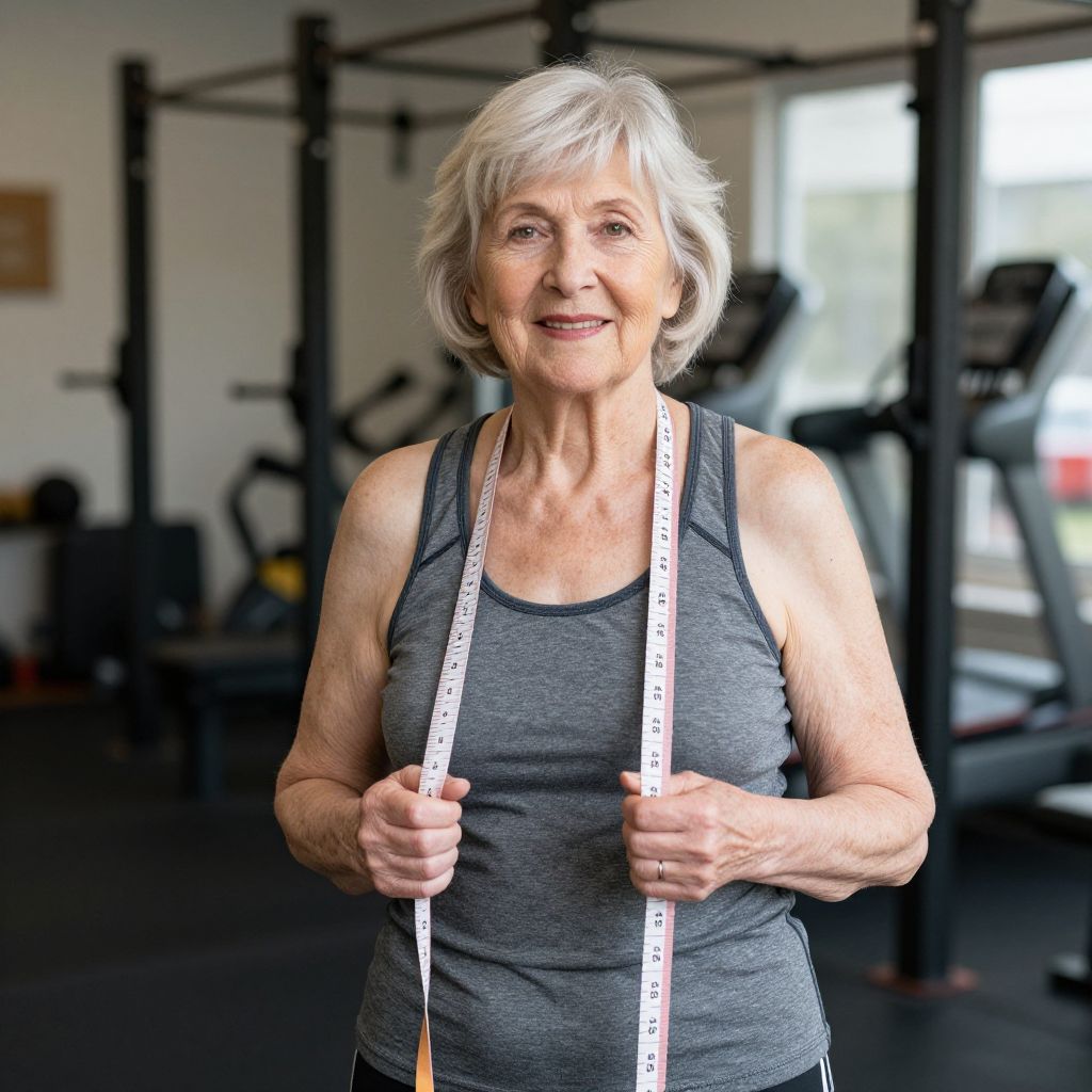 Photograph of an elderly woman with short white hair, wearing a gray tank top, holding a measuring tape in a gym.