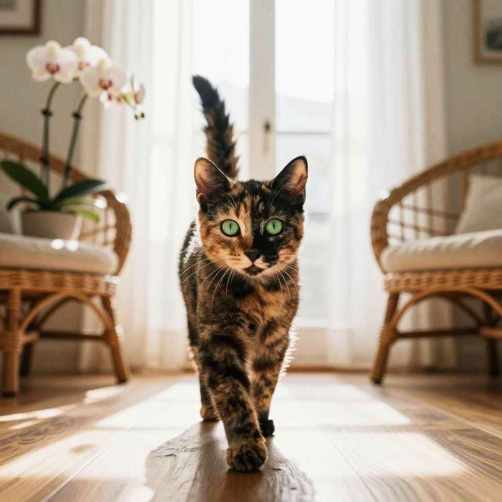 Playful tortoiseshell kitten with curious green eyes confidently walking toward the viewer across bright sunroom featuring wicker chairs and blooming orchids, lit by soft morning light filtering through translucent curtains. Natural textures of fur, fabric, and wood emphasized; inviting and homey atmosphere; shallow depth of field; crisp whiskers; soft vignetting; balanced composition; subtle film grain; realistic color rendering; gentle contrast; fine detail throughout.