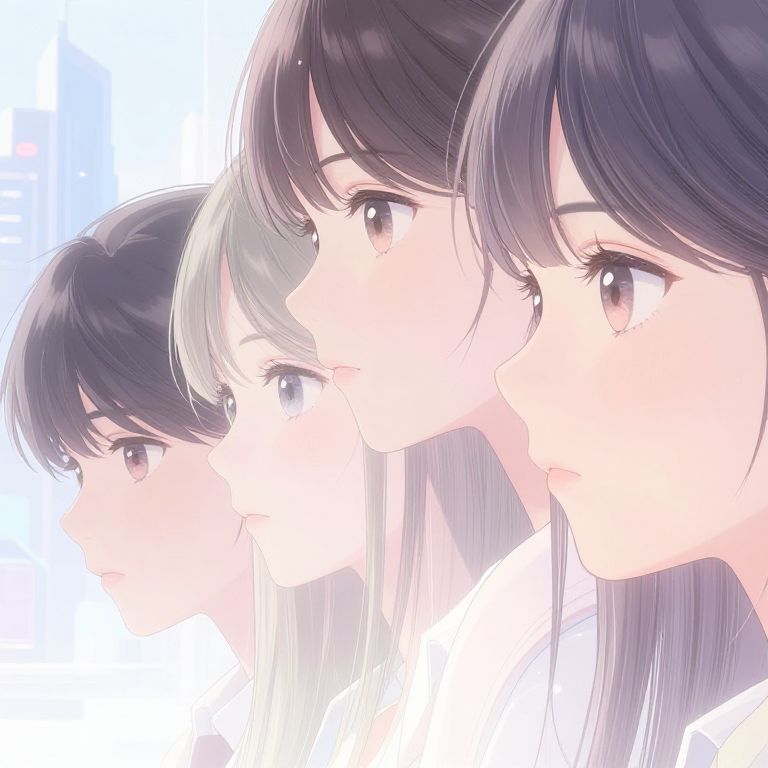 AI generated anime faces, close-up portraits of diverse characters with exaggerated anime eyes, soft pastel color palette, ethereal lighting, delicate linework, futuristic cityscape in the background, high detail on facial features and hair textures, anime style with modern digital painting techniques