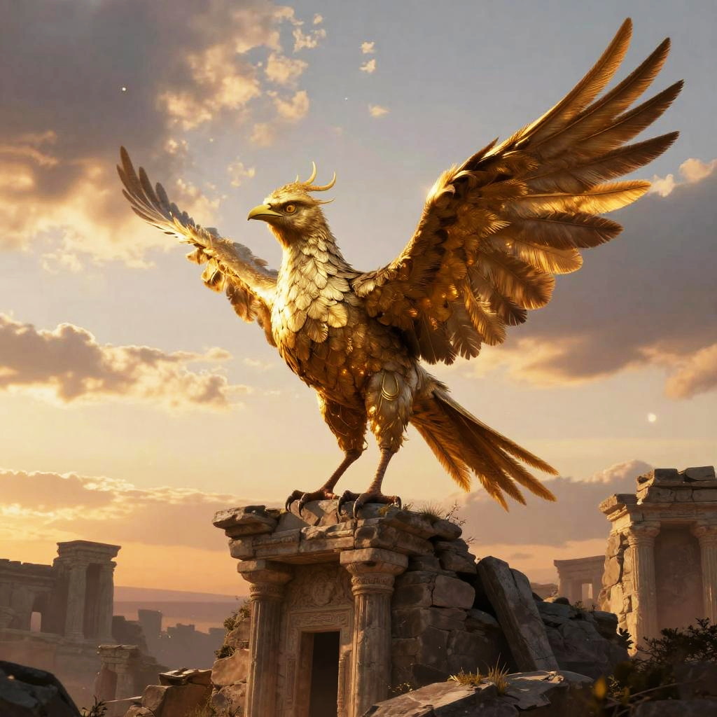 Half human half bird creature perched on ancient ruins at sunset, golden feathers mixed with human anatomy, dramatic sky, ethereal atmosphere, highly detailed textures, fantasy art style