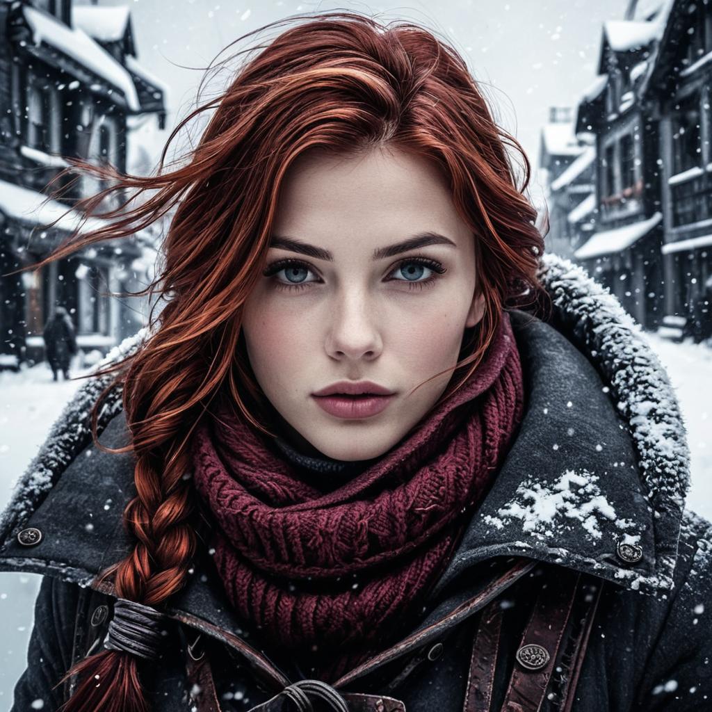 Attractive woman with auburn hair and amber eyes in maroon winter gear out in the snow in the art style of Frostpunk, line drawing colored