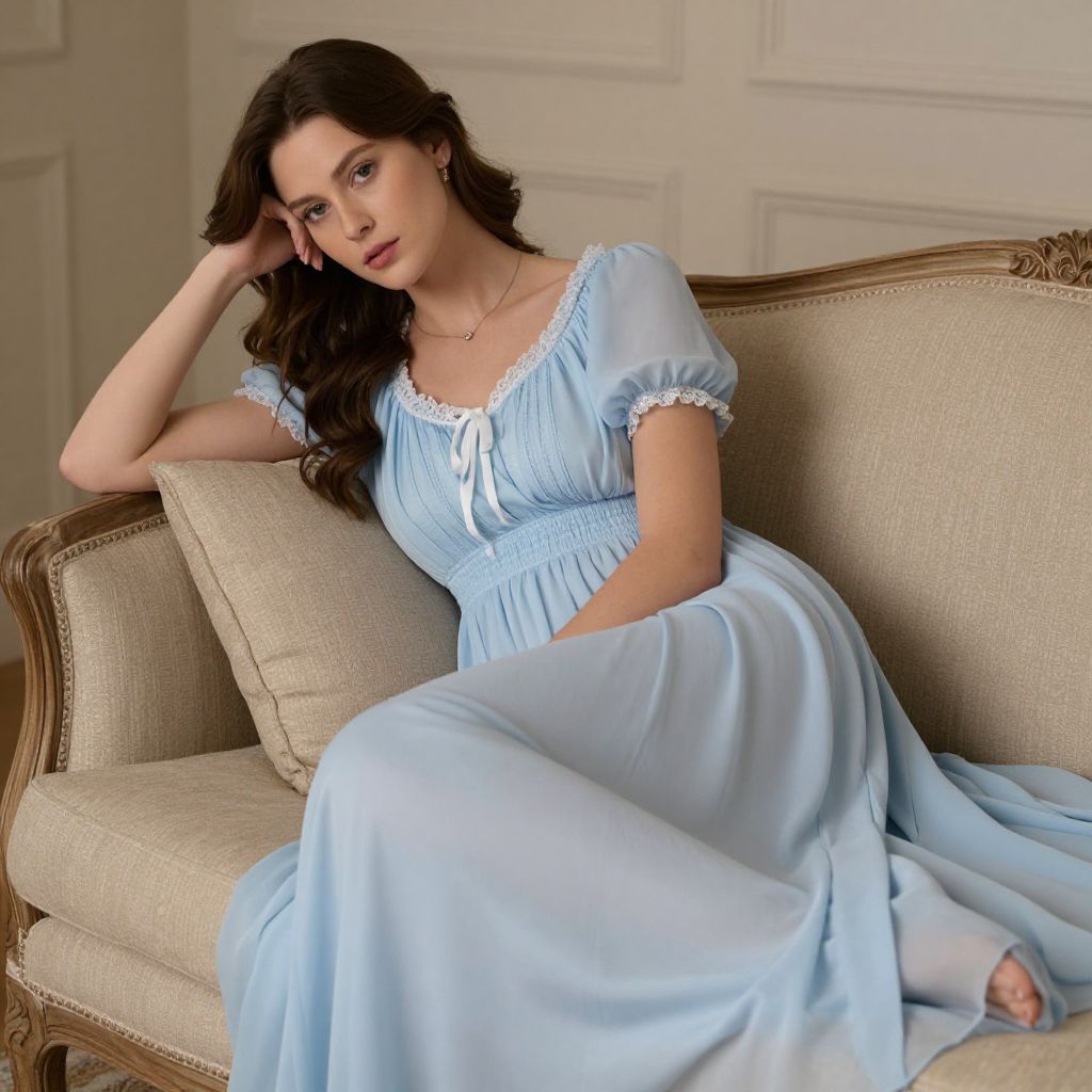 Photograph of a fair-skinned woman with long, wavy dark brown hair, wearing a light blue, Victorian-style dress with white lace trim and short puffed sleeves. She is seated on a beige, vintage-style sofa with wooden trim, reclining with her right arm resting on the back of the sofa and her head tilted slightly. Her expression is neutral, with a subtle gaze towards the camera. The background features a plain, light-colored wall with subtle paneling. The dress is flowing and delicate, contrasting with the textured, woven fabric of the sofa. The lighting is soft, creating a calm, elegant atmosphere.