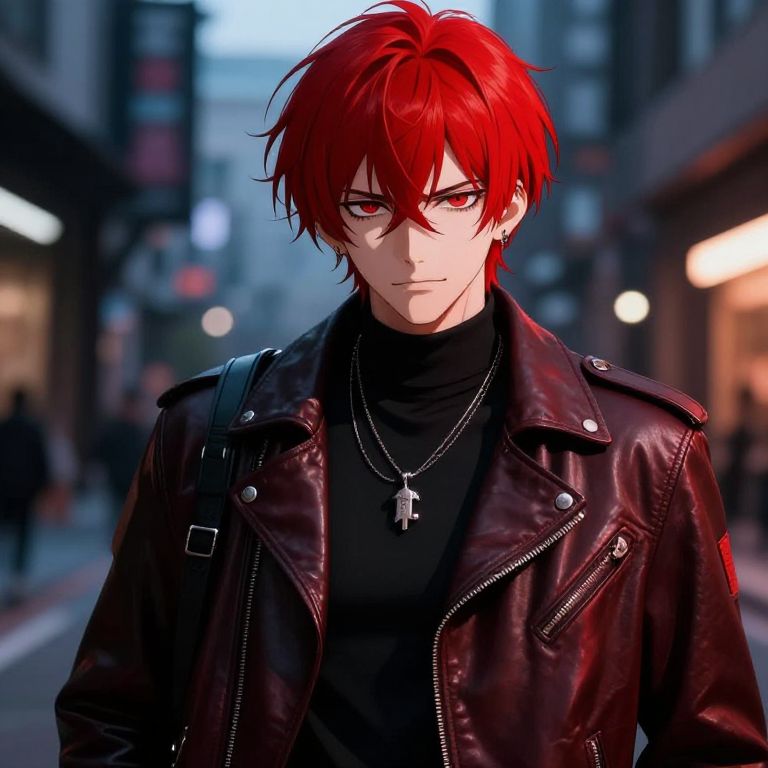 Digital anime-style illustration of a young man with vibrant red hair and piercing red eyes, standing in a blurred city street at dusk. He wears a black turtleneck and a dark, glossy leather jacket with silver zippers and a silver cross necklace. His expression is serious and slightly intense. The background features out-of-focus lights and buildings, creating a nighttime urban atmosphere. The lighting emphasizes his red hair and jacket, contrasting with the dark clothing underneath. His overall appearance is edgy and mysterious.