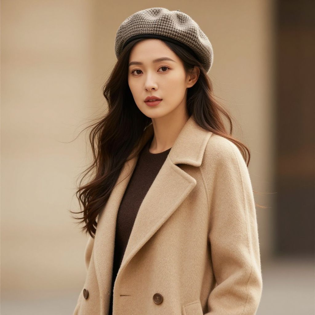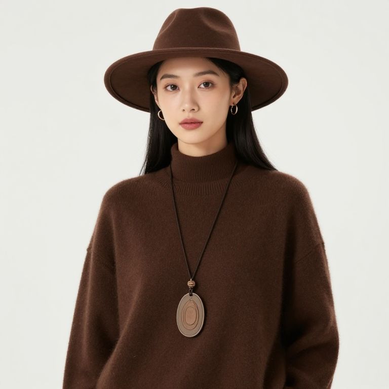 Photograph of an East Asian woman with long black hair, wearing a brown wide-brimmed hat, brown turtleneck sweater, and hoop earrings. She has a neutral expression and is looking directly at the camera. Around her neck, she wears a long black cord with a large, oval, ornate bronze pendant. The background is plain white, making her and her outfit the focal point. The textures of her sweater and hat are soft and slightly fuzzy, contrasting with the smoothness of her pendant. Her makeup is minimal, emphasizing a natural look.