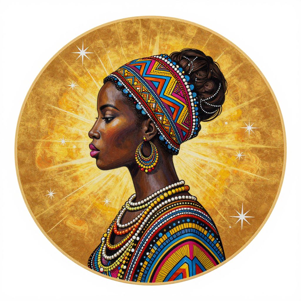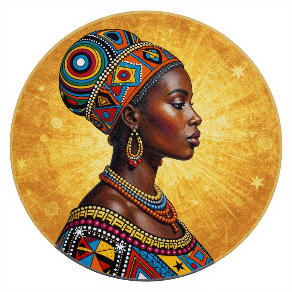 African-inspired round beach towel showcasing Dominic Piperata's painting *Maleea*, featuring a profile portrait of a woman adorned with vibrant geometric patterns, layered beads, and star motifs against a radiant golden background.