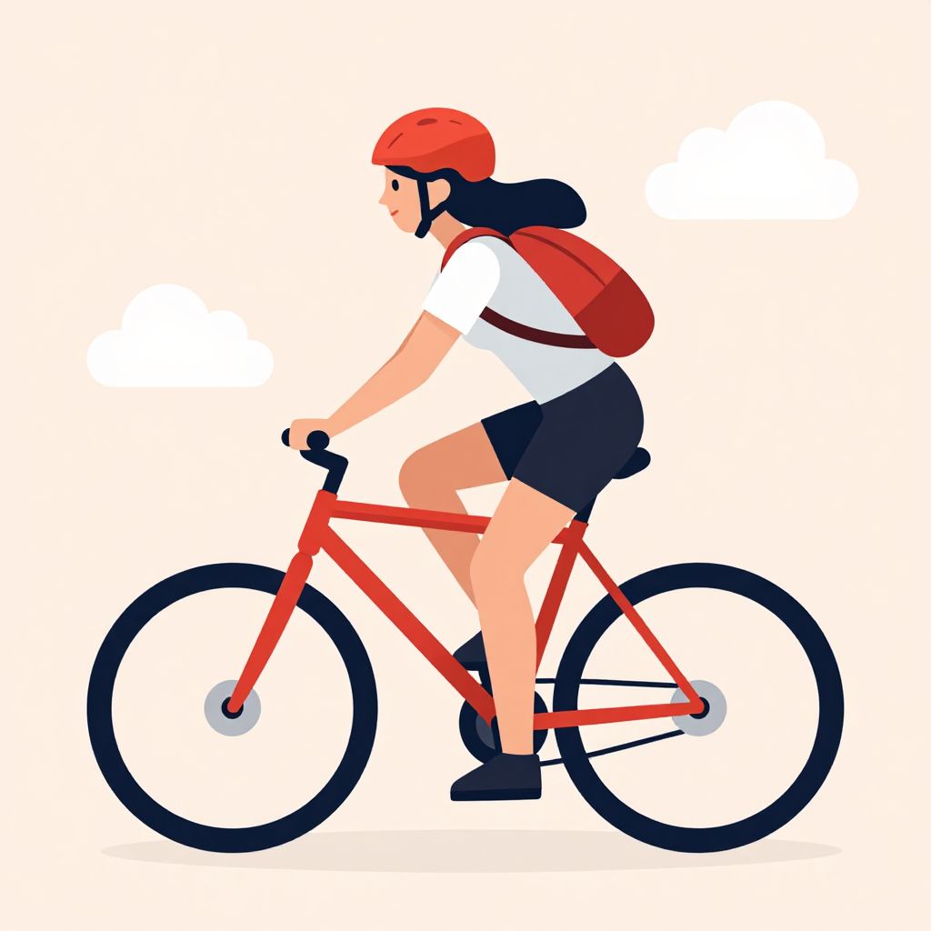 A vibrant cartoon-style illustration depicts a woman riding a red bicycle, wearing a red helmet and black shorts, with a backpack, set against a minimalist background featuring soft pastel colors and floating clouds, showcasing a clean and modern digital art aesthetic.
