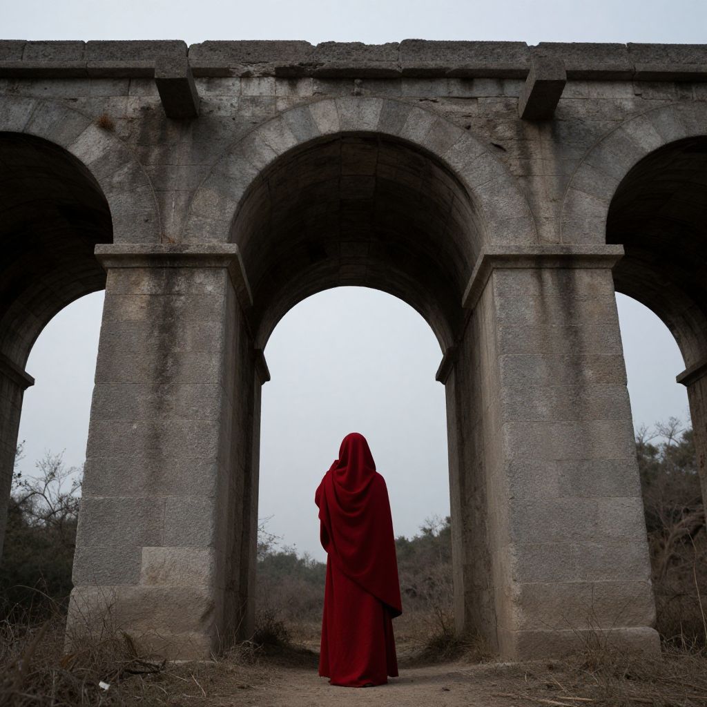 A solitary figure in a crimson robe stands beneath ancient stone arches, their presence a whisper of defiance against the timeless grandeur of a bridge that spans not just land but the chasm of human ambition and nature’s enduring silence, evoking a profound sense of solitude and the eternal dance between creation and decay.