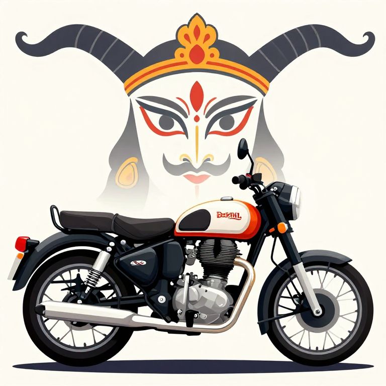 Rack Focus vector illustration of Bhoota Kola face inspired from film Kaantara made out of Royal Enfield Classic 300 motorcycle,