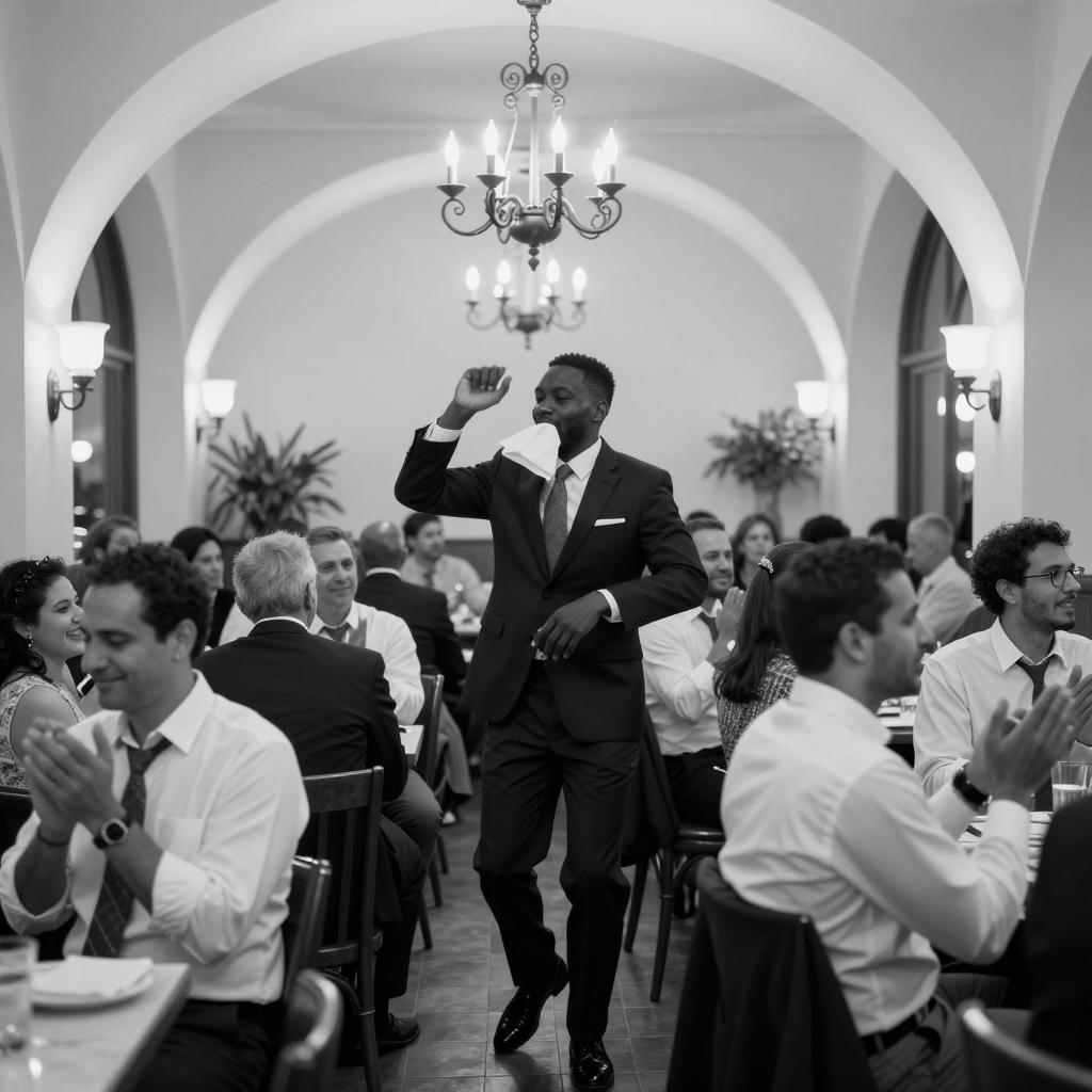 Black-and-white photograph of a crowded restaurant. Central Black man in a suit dances energetically, holding a napkin in his mouth. Other patrons, mostly men in shirts and ties, sit at tables, some clapping. Two ornate chandeliers hang from arched ceiling. Background filled with more people and tables. Light from wall sconces illuminates the scene. Multiple people on left and right, with some standing in the background.