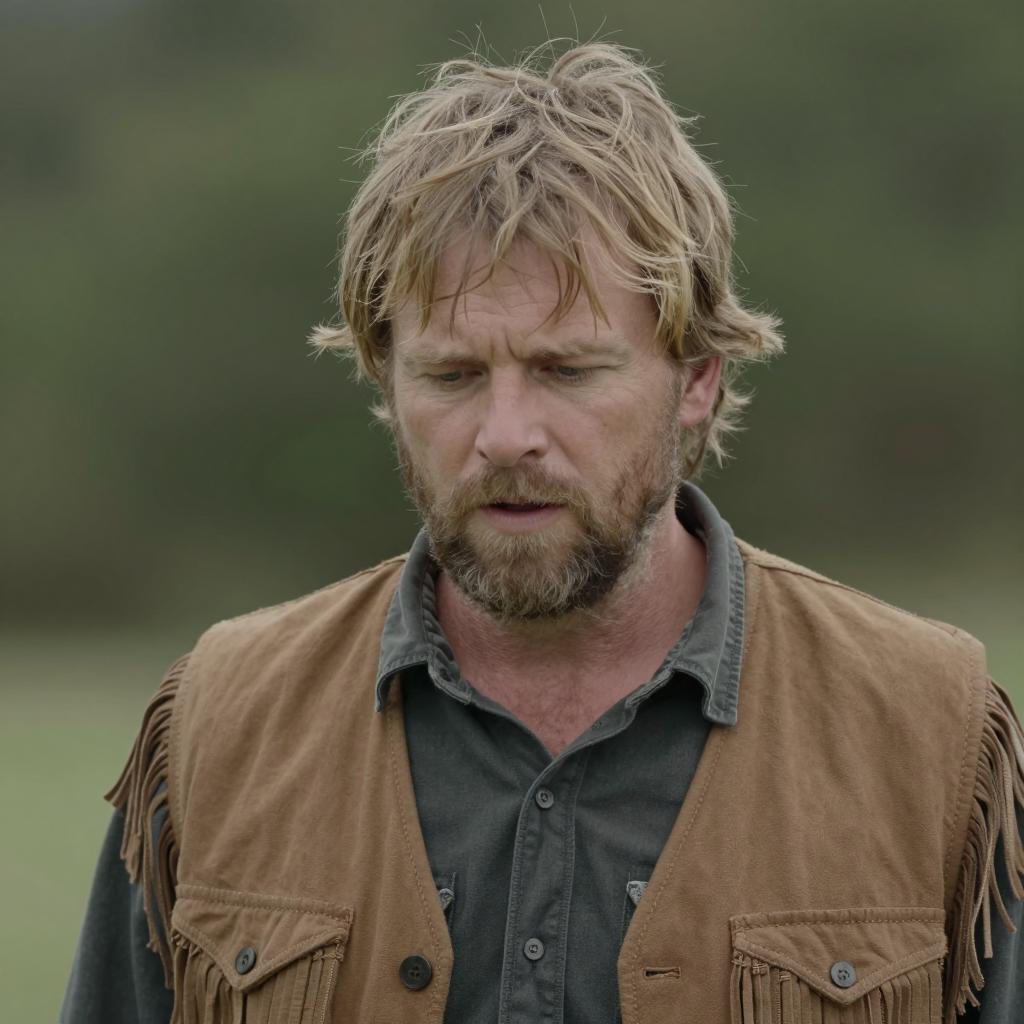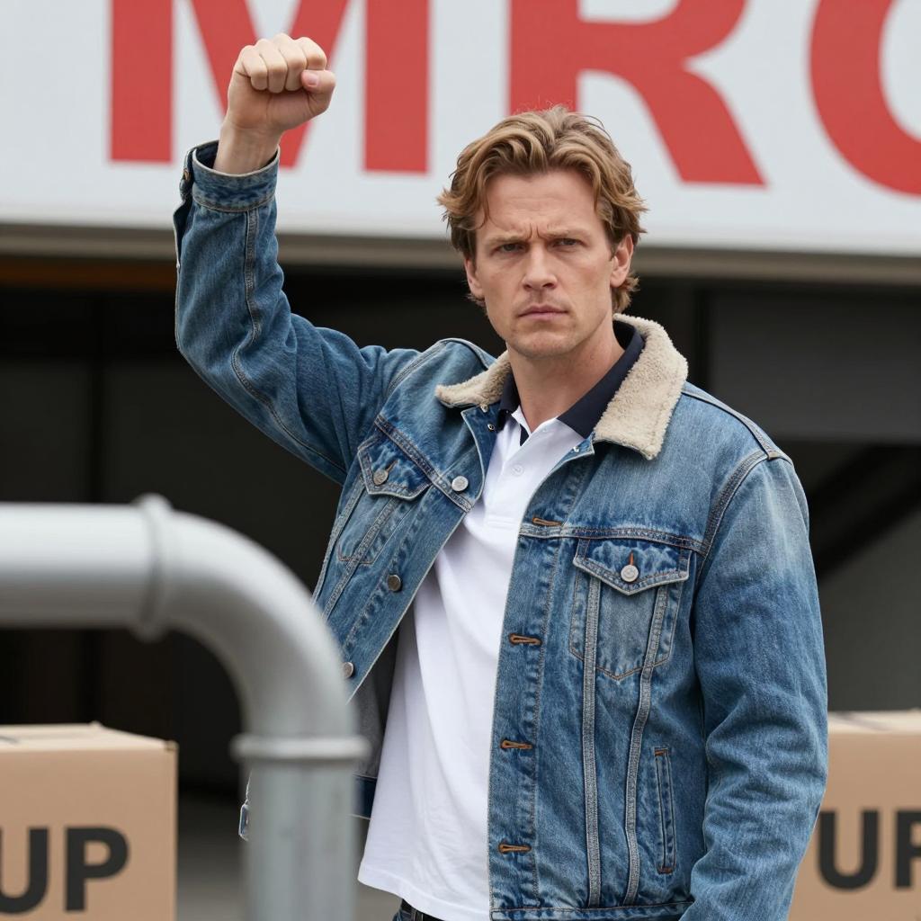A Caucasian man with blonde, shoulder-length hair, wearing a black, button-up shirt. He has a serious expression, slightly parted lips, and a light stubble. The background shows blurred, industrial structures with metal frameworks. He is centered in the frame, with only his upper body visible.