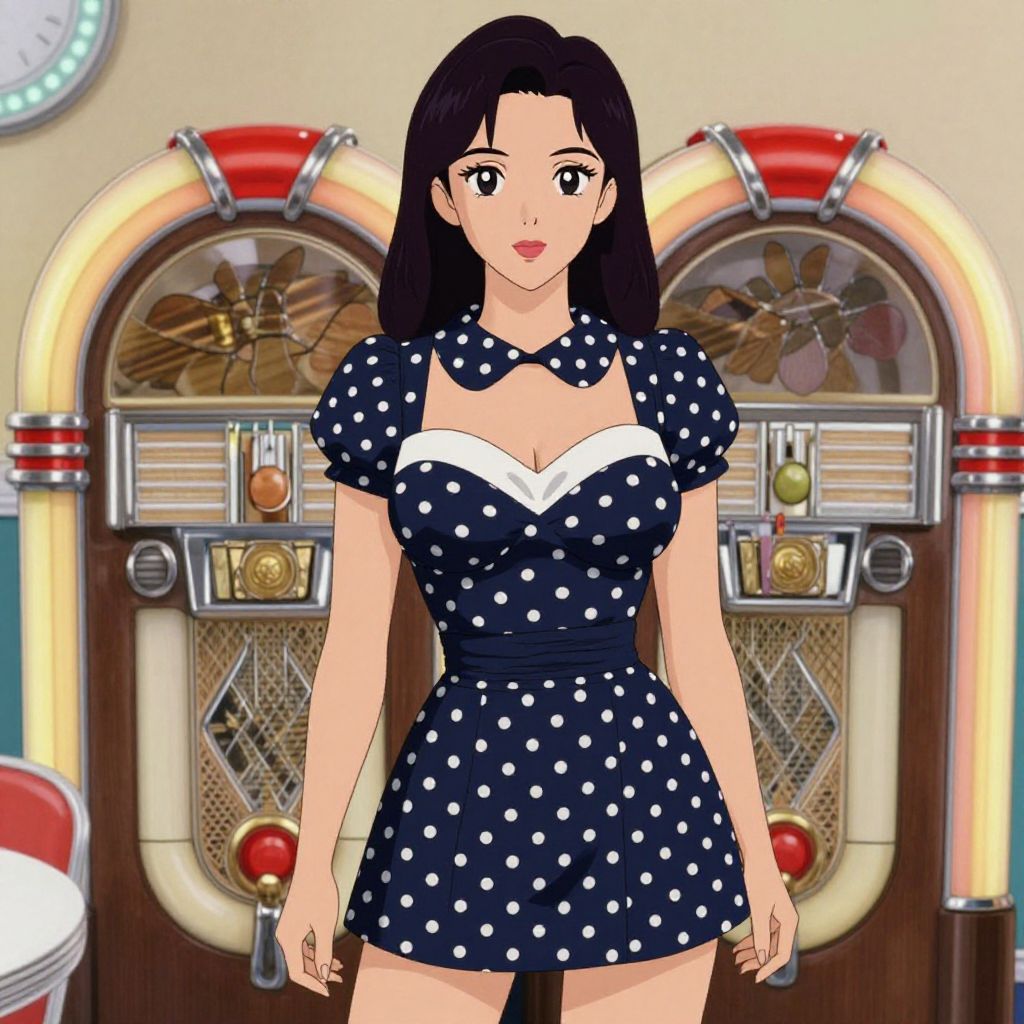 A Stocky woman, in an edgy glam style with a leopard print crop top and high-waisted black vinyl skirt, stands at the vintage boutique in a narrow alleyway, surrounded by eclectic decor, in a Studio Ghibli-inspired scene. Sexy. Pretty face and beutiful eyes Sexy. Pretty face and beаutiful eyes. Big breasts