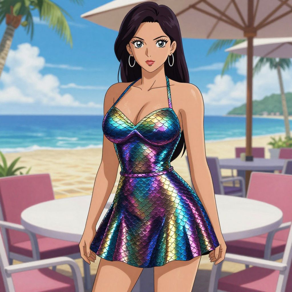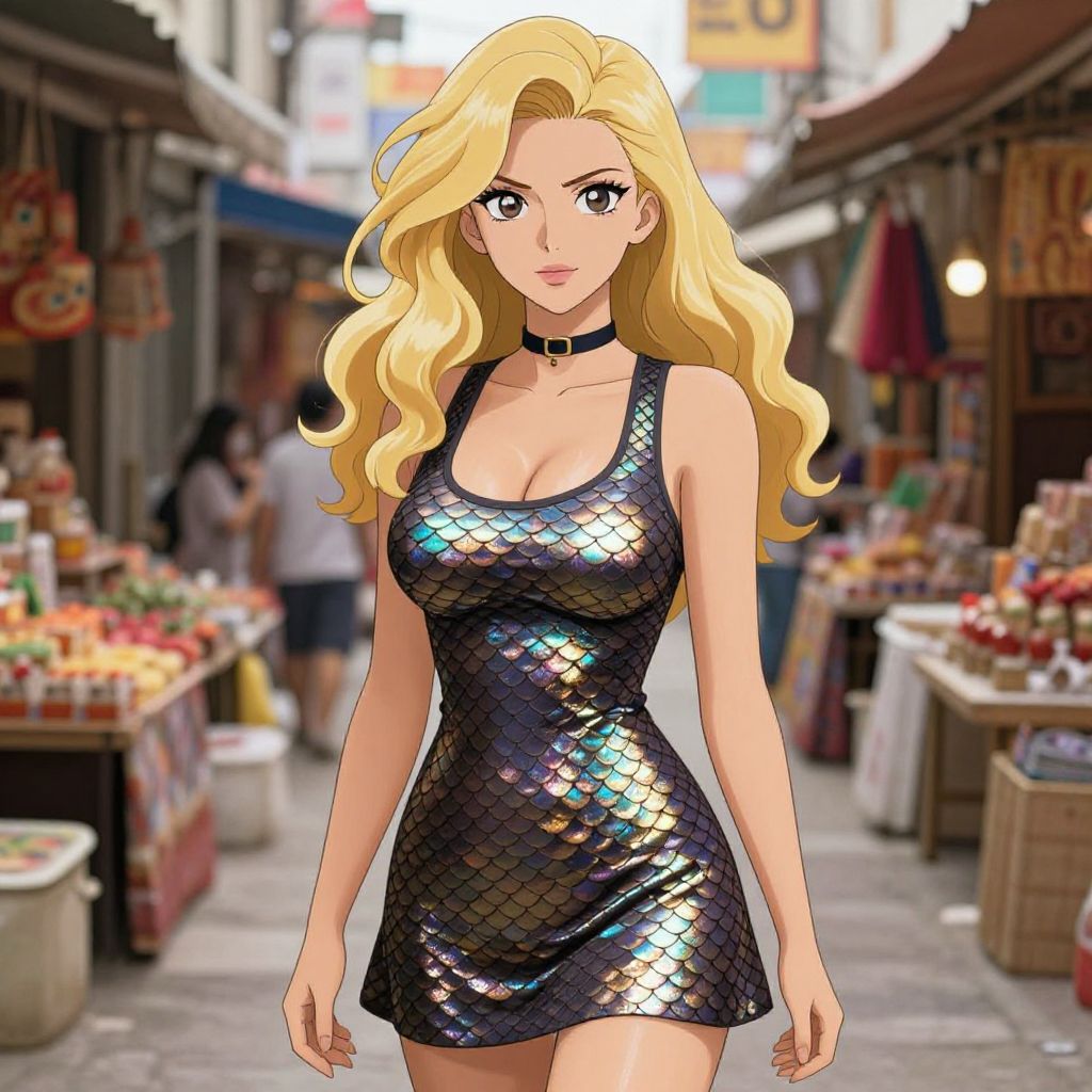 Digital art of a curvy woman with long black hair, wearing a leopard print top and shiny black skirt, walking down a quaint, cobblestone