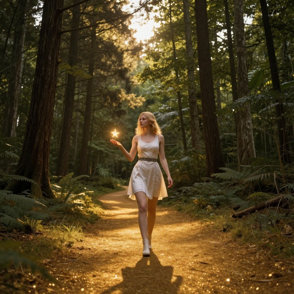A futuristic-dressed woman walks along a winding, golden-lit path through a dense forest, collecting glowing stars, with tall trees and a bright, sunlit sky in the background.