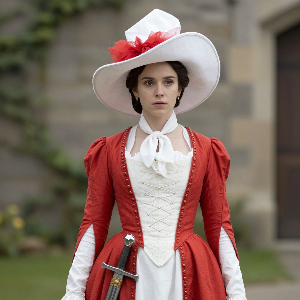 Elizabeth Swann Costume Hat, woman in red and white dress with a hat and a sword