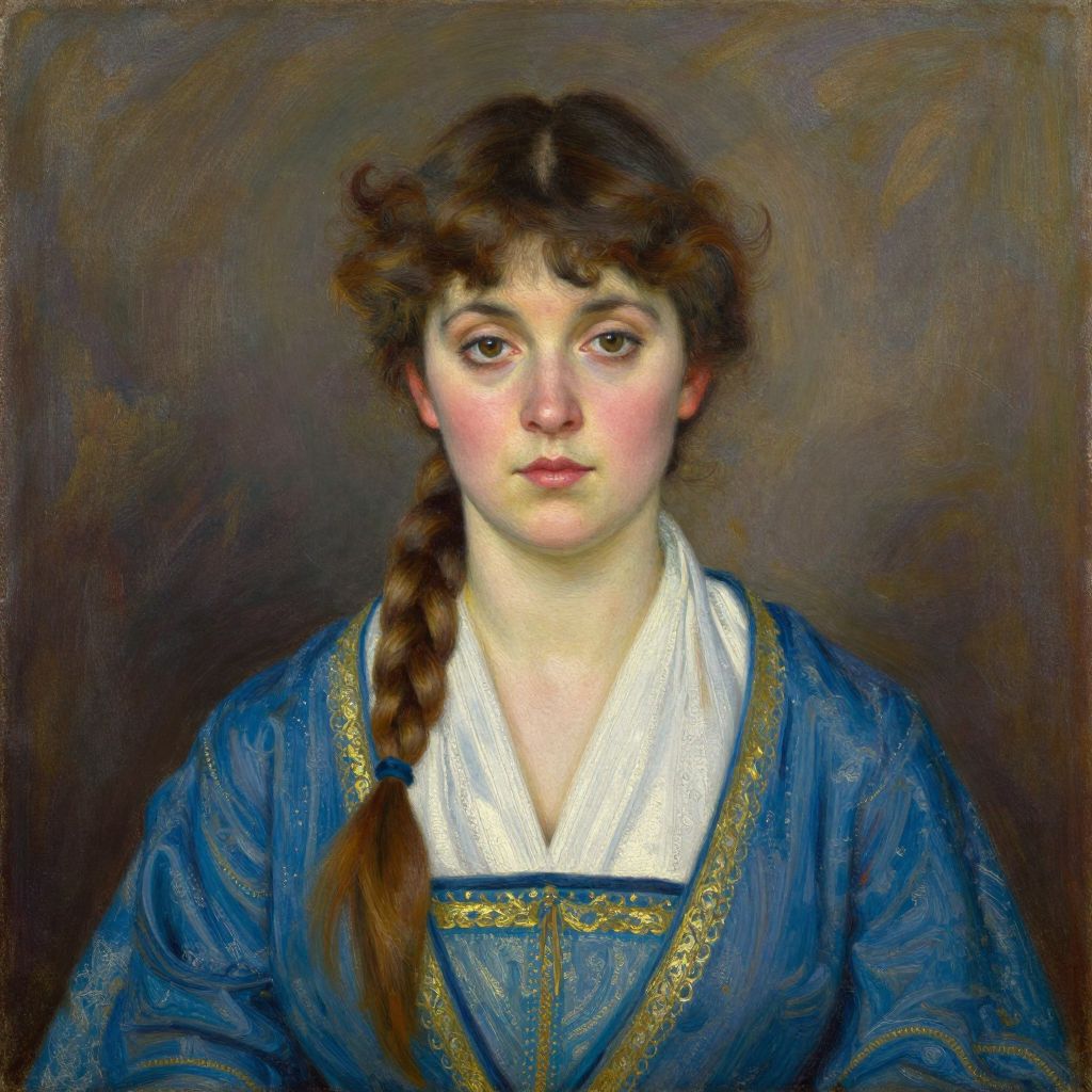 This digital painting depicts a young woman with fair skin and brown, wavy hair in a loose braid over her right shoulder. She has soft, pink cheeks and dark brown eyes, gazing directly at the viewer with a neutral expression. She wears a blue, intricately patterned dress with gold trim over a white, high-collared blouse. The background is a textured blend of dark brown and gray, emphasizing her face and upper body. The artwork has a realistic yet slightly impressionistic style, with visible brushstrokes adding depth to the colors and textures.