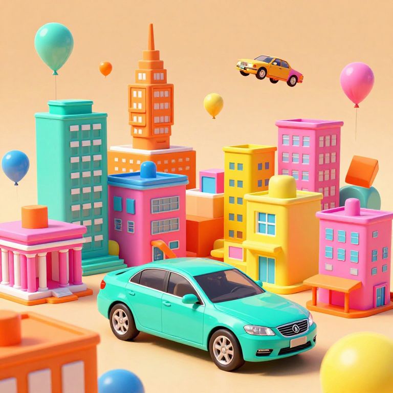 Bright, colorful CGI image of a turquoise car in a playful cityscape with pastel buildings, balloons, a flying car, and a pink bank.